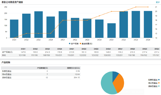 南华基金成立于2016年11月17,由南华期货股份有限公司100%持股,注册资本为3.5亿元人民币。这一股权结构使其成为国内第一家“期货系”公募基金管理公司。截止2025年四季度末,资产规模217.4亿元,排序110/164位。与同期成立的其他特色系公募相比,如银行系的理财子公司或互联网系基金,南华基金需更精准地定位自身优势,避免陷入同质化竞争。