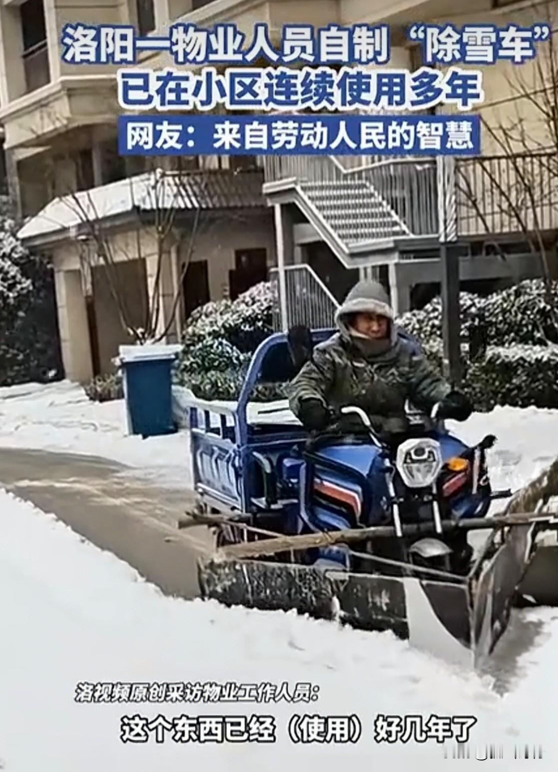 洛阳一物业人员,开通脑路,独辟蹊径,创造发明了经济高效、省时省力的除雪神器。 洛阳物业人员自制“除雪车”在小区开道这一事件,看似微小,却蕴含着丰富的启示。这一充满“草根智慧”的创新之举,展现了基层工作者面对困难时的能动性与创造性,其意义远超工具改良本身。 这辆由V型木板与电动三轮车组合而成的“除雪神器”,其价值在于基于现实条件的精准创新。它没有依赖高投入或复杂技术,而是精准聚焦于“快速开辟人行通道”这一需求,利用手边材料实现功能的创造性。这种“低成本、高适用性、易推广”的特点,正是基层实践智慧的典型体现。 笔者认为:他为基层治理与公共服务提供了启发,在资源有限的情况下,鼓励一线人员发挥主观能动性,进行“微创新”,往往能收获意想不到的效果。 【注】图片及参考信息来源 掌上洛阳 冬日生活打卡季 洛阳身边儿事