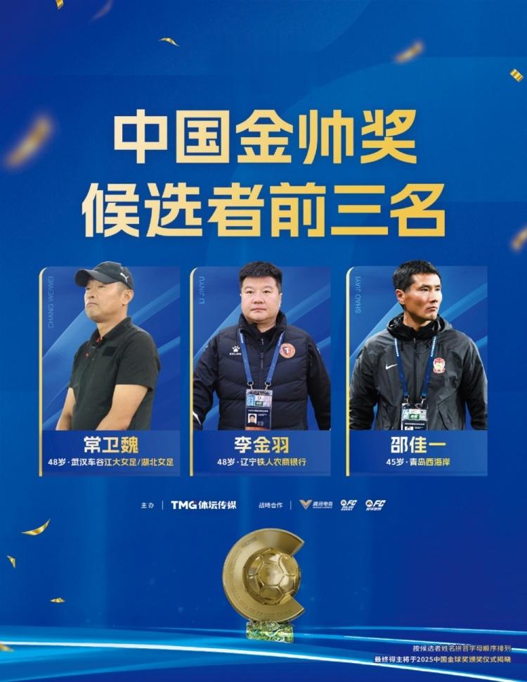 直播吧1月22日讯《足球周刊》公布了2025中国金球奖各奖项前三名,其中常卫魏、李金羽、邵佳一跻身中国金帅奖前三名。