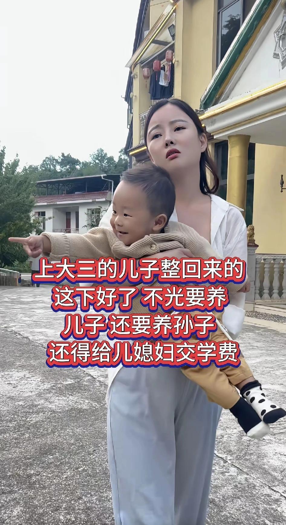 上大三的儿子整回来的,这下好了,不光要养儿子,还要养孙子,还得给儿媳妇交学费…… 真的笑不活了!这届家长也太可爱了,嘴上说着又要养娃又要养孙的辛苦,字里行间全是藏不住的欢喜!大三儿子上学上着,直接把儿媳妇和大胖孙子一起带回来了,这波操作直接让宝妈38岁就当上奶奶,怕是全国最早的一批了吧! 花一份大学学费,直接解锁儿媳妇+大胖孙子双份惊喜,这买卖简直血赚!学习生育两不耽误,不光省了十年晚婚晚育的光阴,彩礼婚房的烦心事也直接省了,娃还聪明健康,妥妥的一举多得! 别看宝妈嘴上吐槽要给儿媳妇交学费,心里指不定多得意,这可是积德换来的好福气,收买人心还抱上大孙子,偷着乐还来不及呢! 不得不说这儿子太会来事了,直接让爸妈一步到位,跳过催婚催生的所有环节。大家说说,这是不是全网最幸福的奶奶,这波操作该不该给满分?