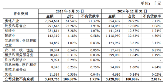 更为棘手的是房地产业务的风险暴露。截至2025年6月末,青岛农商行在房地产业的公司不良贷款规模为20.95亿元,占比61.54%;房地产业不良率也由2024年末的7.17%大幅提升至21.32%。
