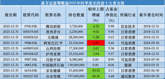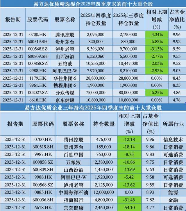 与上述两只基金类似的是,在2025年四季度,张坤旗下的易方达优质精选基金、易方达优质企业三年持有也并未更迭前十大重仓股,仅对部分个股进行了减持操作。