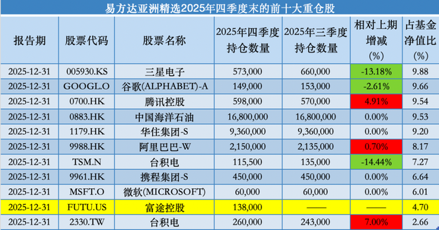 另一方面,三星电子(005930.KS)持股数量单季度减少13.18%后,仍然跃升为易方达亚洲精选的头号重仓股,不过由于该股所占基金净值比达9.88%,已接近顶格配置,再叠加2025年四季度区间涨幅来看,或为张坤被动减仓行为。