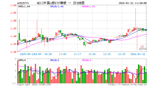 1月22日,截止午间收盘,MSCI中国A股ETF摩根(515770)跌0.21%,报1.434元,成交额526.59万元。MSCI中国A股ETF摩根(515770)重仓股方面,贵州茅台截止午盘跌0.30%,宁德时代跌2.80%,工业富联跌0.58%,招商银行跌0.94%,寒武纪跌0.24%,长江电力跌0.71%,紫金矿业跌2.31%,比亚迪跌0.10%,中国平安跌1.47%,海光信息跌0.89%。