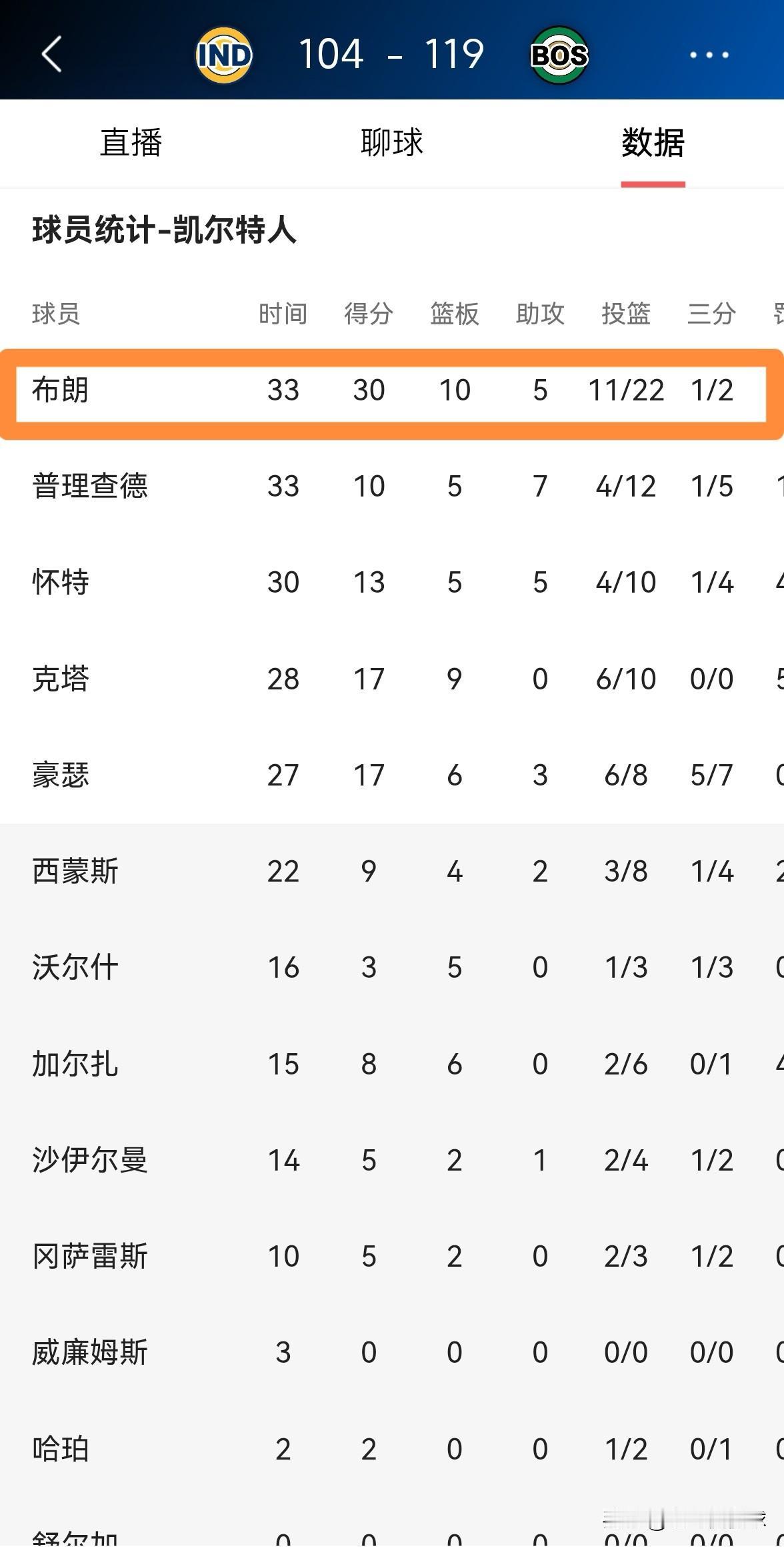 凯尔特人二当家杰伦-布朗真是一名全能型的巨星!在今天凯尔特人主场以119:104轻取步行者的比赛中,布朗打出了非常全面的表现,整场比赛下来,布朗首发出战33分钟,投篮22中11,其中三分球2中1、罚球9中7轰下30分,还有10篮板5助攻3抢断6失误,他的场上正负值为+11。 尽管本场比赛布朗出现了6次失误,但是以他为球队做出的巨大贡献来看,这些失误完全可以忽略不计。