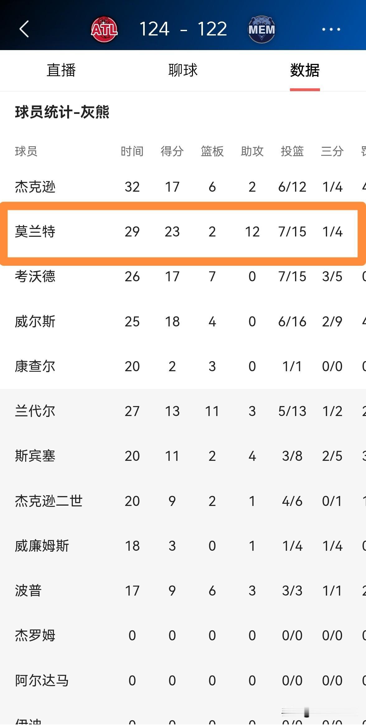 我强烈建议灰熊务必留下当家球星莫兰特!虽然今天灰熊在主场以122:124惜败于老鹰,但是莫兰特在攻防两端都打出了无可挑剔的表现,值得一提的是,本场比赛莫兰特在攻防两端都展现出了超强的拼搏精神和赢球欲望。 全场比赛下来,莫兰特首发出战29分钟,投篮15中7,其中三分球4中1、罚球8中8得到23分2篮板12助攻1抢断3盖帽,他的场上正负值为+1。 事实证明,当莫兰特全身心的投入到比赛中的时候,他依然是当今联盟最出色的后卫之一,对此我建议灰熊务必留下莫兰特,莫兰特绝对值得信赖。