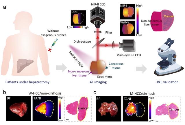 近日,复旦大学张凡/何海生团队联合附属华山医院钦伦秀/朱文伟团队,成功创制了一种无需注射任何造影剂的术中实时肿瘤边界可视化新技术,即组织自发荧光近红外成像技术(TissueAutofluorescenceNIR-IIImaging,TANI)。该技术通过利用组织内源性荧光物质在近红外二区(NIR-II,1000-1700nm)的信号差异,实现了多种肝脏恶性肿瘤边界的清晰、高对比度可视化,并有效避免了血液和胆汁污染、肝硬化背景以及良性病灶带来的干扰。研究团队进一步于多例患者体内验证了该技术在外科手术导航中的应用潜力,为肝脏恶性肿瘤的精准切除提供了全新的临床辅助手段。