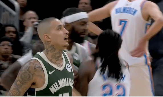 波蒂斯感觉是上一个回合被SGA突破推倒那一下就不爽,坐地上一直不起来,情绪一直延续到这个回合上头了搞事情了……