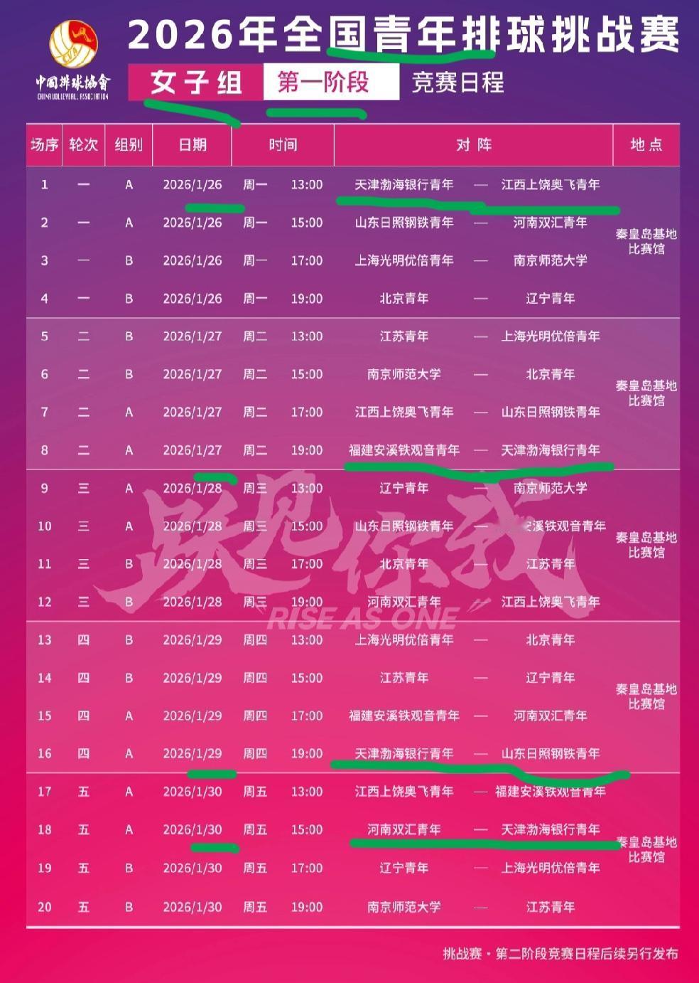 排超联赛: 天津青年女排第一阶段比赛时间表出炉! 天涯体育排球讯 北京时间1月22号消息,今天是星期四,排超联赛第11轮比赛本周六下午继续进行。 今天排超联赛官方网站发文,公布了新赛季青年女排的排超联赛第一阶段的比赛时间表! 全国青年排球挑战赛第一阶段,比赛时间从1月26号到1月30号五天时间。每天四场比赛,两场A组比赛,两场B组比赛。比赛场地在秦皇岛基地。 天津渤海银行女排青年队在A级比赛组。第一阶段要打四场比赛。 第一场比赛1月26号,天津女排青年女排对阵江西青年女排。 第二场比赛1月27号,天津青年女排对阵福建青年女排。 第三场比赛1月29号,天津青年女排对阵山东青年女排。 第四场比赛1月30号,天津青年女排对阵河南青年女排。 为什么没有天津青年女排对阵江苏青年女排的比赛呢。原来天津青年女排在A组.江苏青年女排在B组比赛。两支队伍第一阶段不在一个小组比赛。后面第二阶段比赛,根据第一阶段比赛成绩在分组,也许就在一个小组打比赛了。 青年女排的排超联赛,目前还不知道会不会有比赛的直播信号,目前也没有公布直播计划。根据以前的比赛经验,中国排协官方微博应该会有比赛的直播信号。比赛场地分为主馆和副馆。主馆比赛场地较好,副馆比赛场地一般。 全国青年排球挑战赛1月26号开打,第一阶段一周比赛时间,每天有四场比赛。球迷们又有比赛可以观看了!天涯体育排球讯
