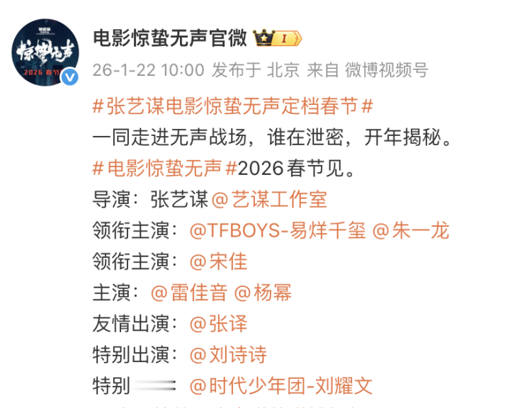 “一同走进无声战场,谁在泄密,开年揭秘。电影《惊蛰无声》2026春节见。”张艺谋导演新作《惊蛰无声》今日宣布定档2026年春节,并同步发布“有间谍”版定档预告与“别泄密”版定档海报。