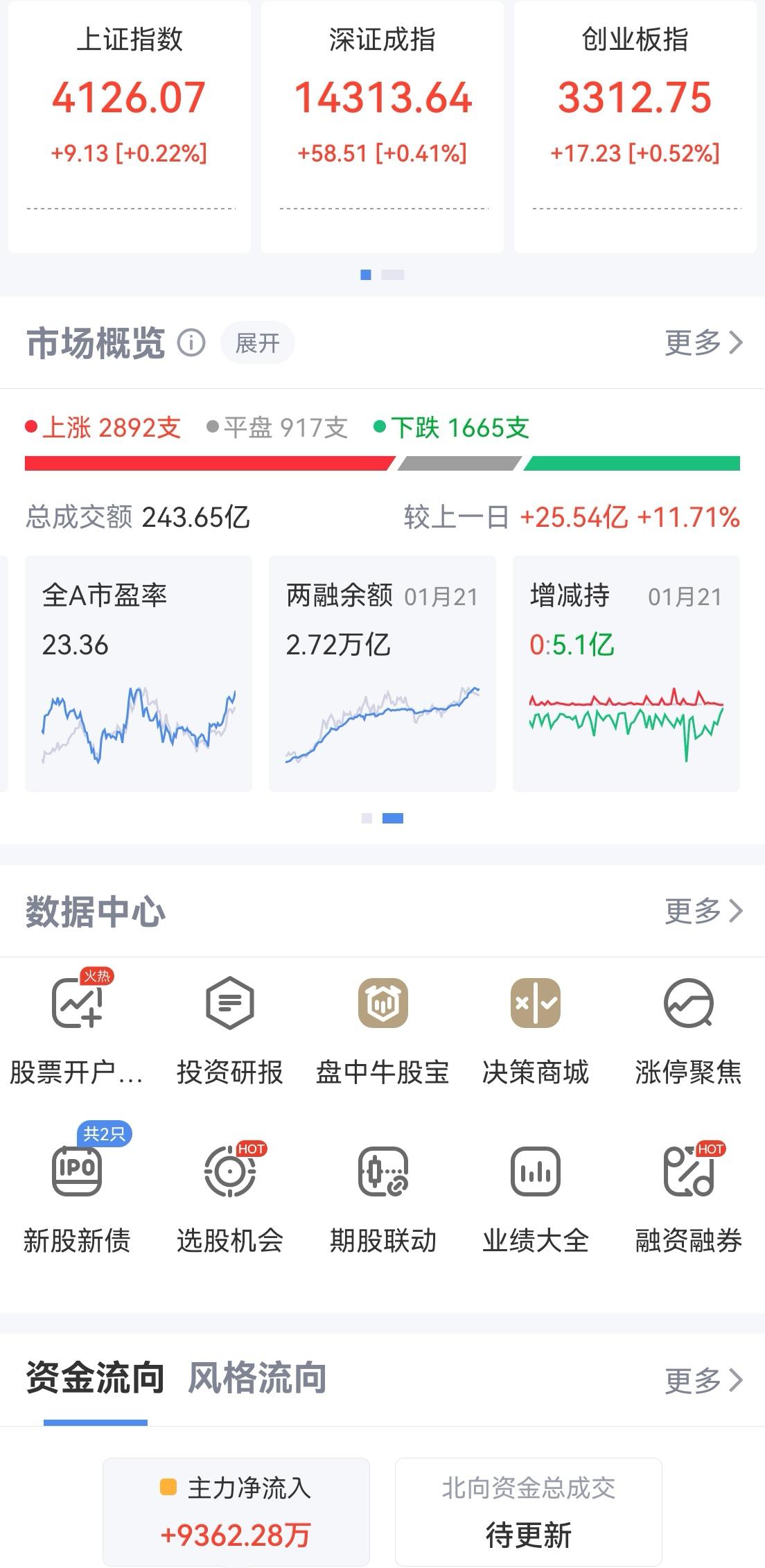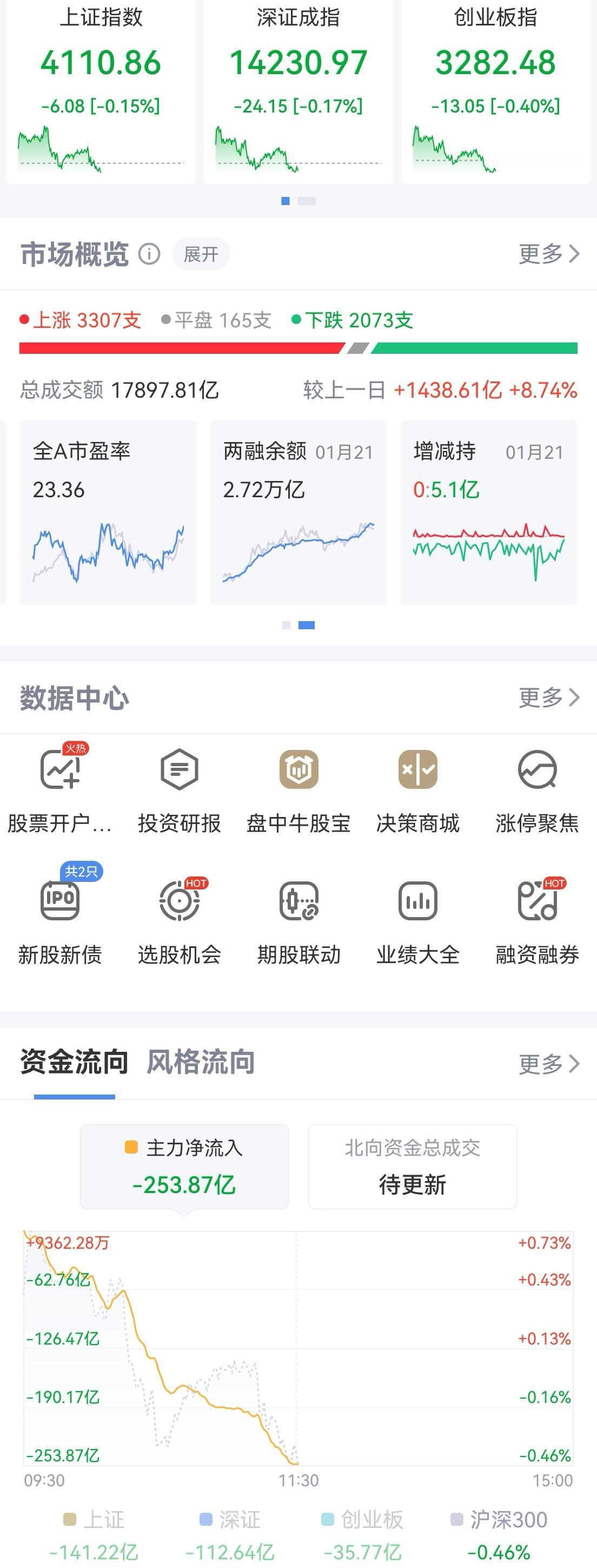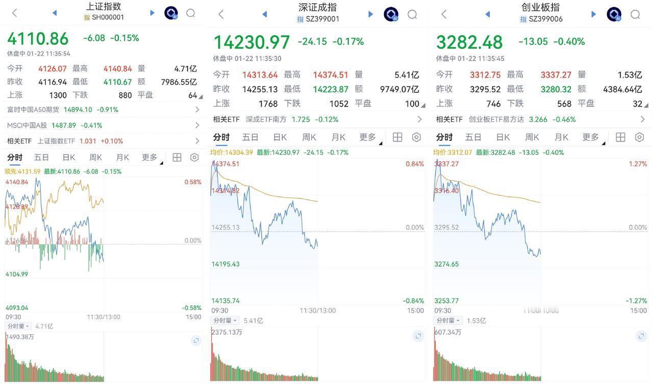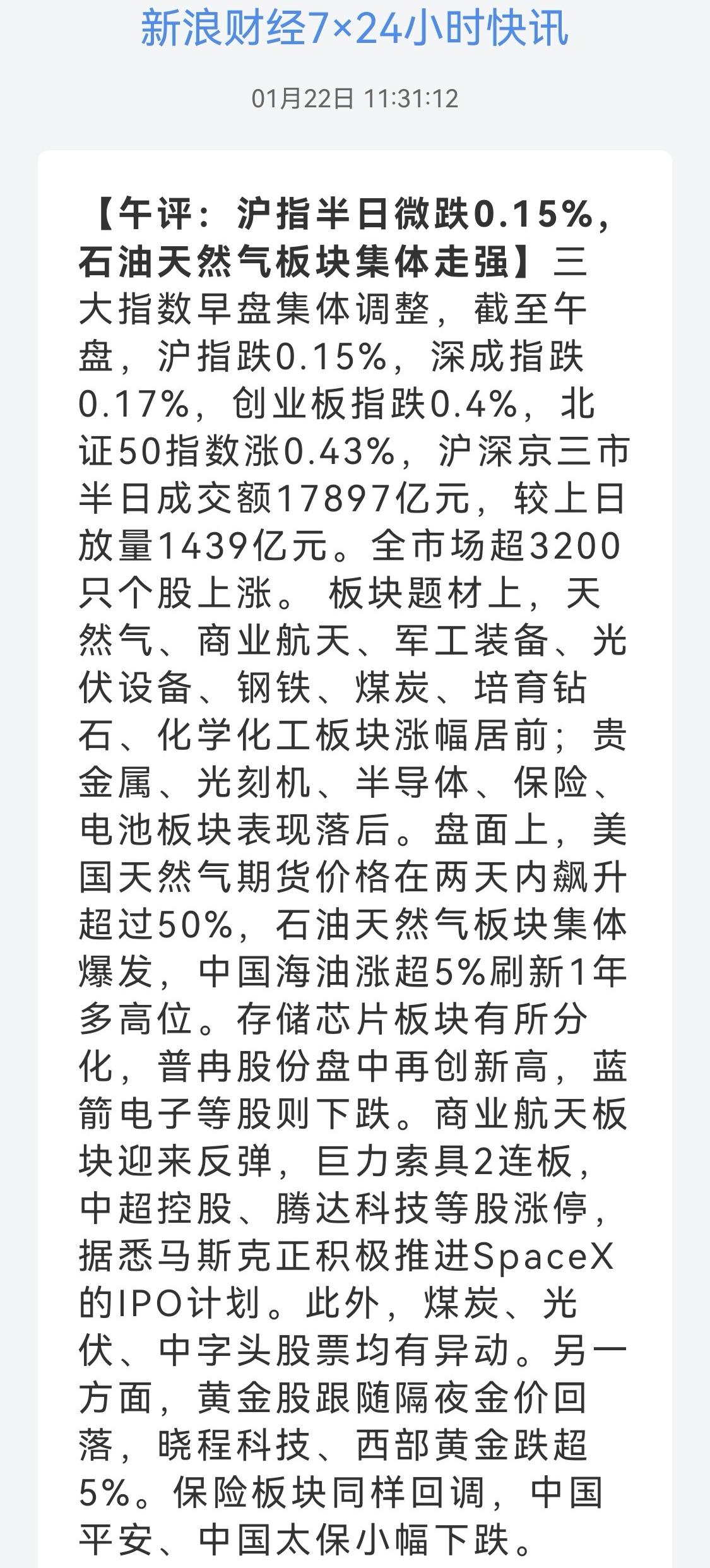 午盘印象(1月22日) 情绪波动 调控不停 外围:美股大涨 科技股强势 影响正面 内股:科技分化 指数波动 红利控盘 一、三大股指开红: 指数开盘稍强势 个股开盘涨平跌比率53%:17%:30%。 个股开盘巨弱(+23 Vs -60个百分点), 远胜上个交易日,多日受压后反击 二、指数冲高又跳水 科技分化,商业航天回归,红利连续调整 半日交易1.77万,量能扩张 降温降杠杆延续 三、涨跌幅榜: 科技分化,红利连续控盘 跌幅前列:黄金、红利、半导体 涨幅前列:商业航天军工、石化能源、建材 四、开盘和午盘: 开盘:沪+0.22%、深+0.41%、创+0.52%。 午盘:沪-0.15%、深-0.17%、创-0.40%。 高开冲高回落,宽基ETF调控中 五、午盘个股上涨60%,已近六成,与昨日涨跌差距(+22 Vs +12个百分点),连续改善 相比开盘,涨跌差走平,个股波动; 净流入 -254 (+134)亿,资金又开始流出 六、沪深两市成交量午盘17,736亿,上个交易日16,310亿,同比量能大幅扩张超1,400亿,放量微绿。 七、指数高开高走回落 主动调控 融资额连续2天下降之后,昨日又上升116亿,引来昨日及今日早盘宽基ETF再度调控 午后两种情形: 1、横盘震荡:时间换空间,适应调控,震荡消化获利。 2、震荡回调:高位谨防跳水,情绪未稳定,慢牛格局不变。