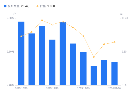 日期A股户数(户)流通A股户均持股数(股)户均持股市值(万元)2026-01-202540411889.9211.692026-01-092550711841.9111.582025-12-312516512002.8411.382025-12-192598511624.0711.602025-12-102649111402.0411.612025-11-282777610874.5511.222025-11-202672511302.2111.582025-11-102755110963.3611.352025-10-312709511147.8711.232025-10-202779610866.7310.83