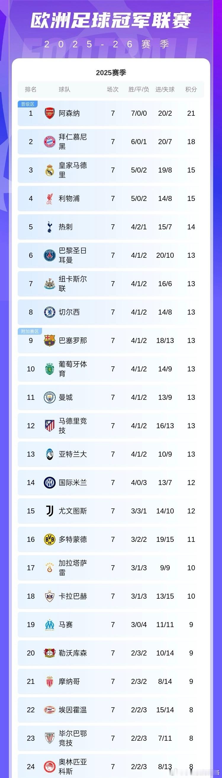 无敌赛制!欧冠仅剩1轮才2队锁定16强,13队争6直通+17队争附加赛北京时间1月22日欧冠联赛阶段第7轮战罢,仅剩1轮的情况下仅有2队锁定直通名额。目前欧冠前二名阿森纳和拜仁确定了直通16强名额,但有且仅有他们两队。从第3的皇马往后数,有13支球队将竞争直通淘汰赛的名额,其中第6巴黎到第13亚特兰大均为13分,8队同分竞争难度可想而知。榜单下半部分,冲击附加区的球队同样夸张(17队)。虽然关注度远低于直通区竞争,但是5队同积8分,理论上还能晋级的球队要截止到第32名,激烈程度也是非常之大。