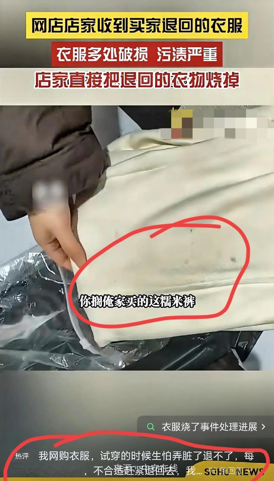 气炸! 浙江网店卖家收到退回的糯米裤, 直接点火烧掉!! 衣服不仅多处破损,污渍更是脏到没法清洗。 普通买家试穿新衣都小心翼翼,生怕弄脏退不了,可这位买家倒好,把刚买的裤子穿成“战损款”就申请退货。 卖家称:这衣服既没法二次销售,低价处理又怕影响口碑,烧掉是唯一的办法。 一边是卖家的成本打水漂,一边是买家滥用“七天无理由”权益,这场矛盾的背后,是中小商家在退货规则里的无奈。 这波到底是谁的错?你遇到过这种奇葩买家吗?退货衣服