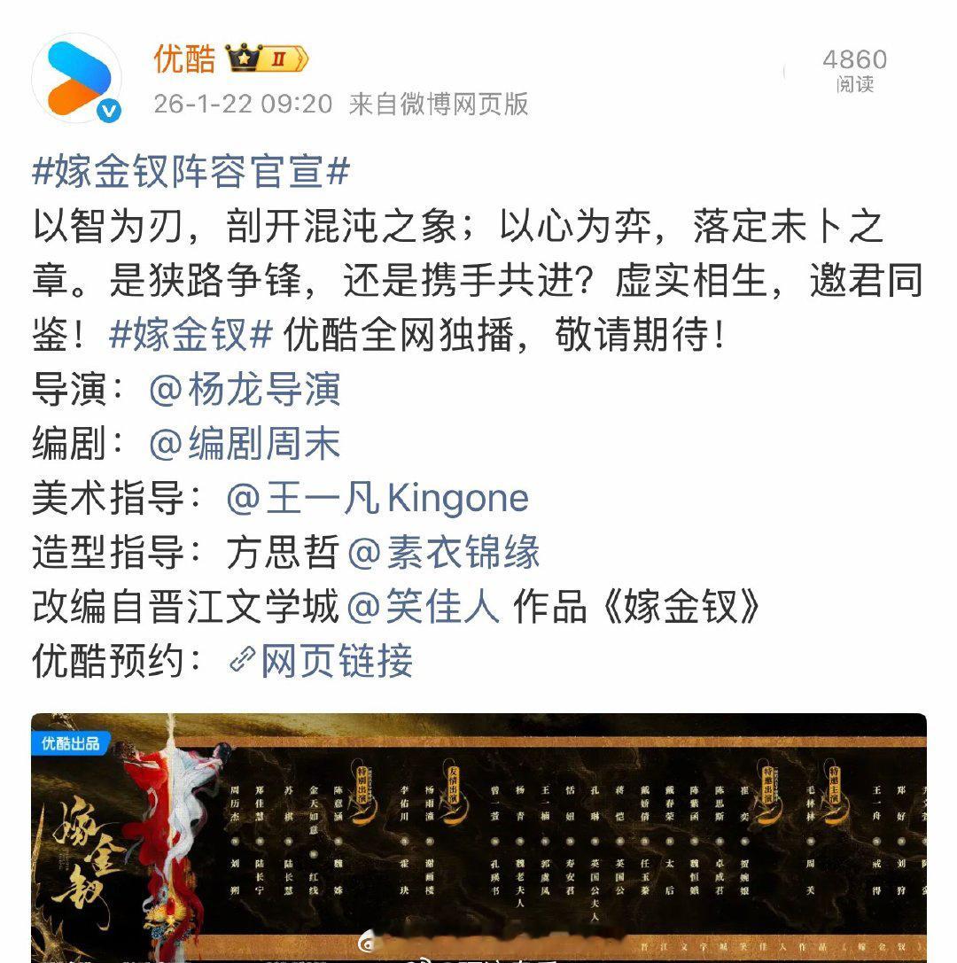 嫁金钗阵容官宣,期待一番女主田曦薇