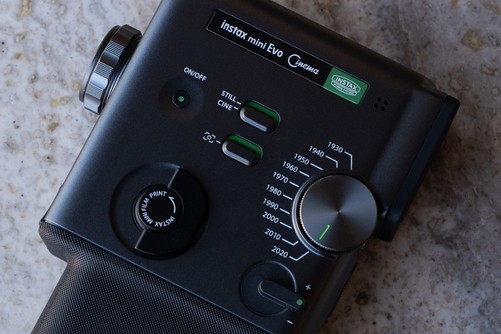 EvoCinema的大部分操作按键主要集中在机身侧面,另一侧则是用于安装instaxmini相纸的舱门。除了电源开关、拍摄模式切换拨杆、变焦杆以及出片拨杆外,EvoCinema还配备了一枚“年代效果转盘”用户可以通过旋转这枚转盘来切换不同的年代效果,以实现不同的画面风格。