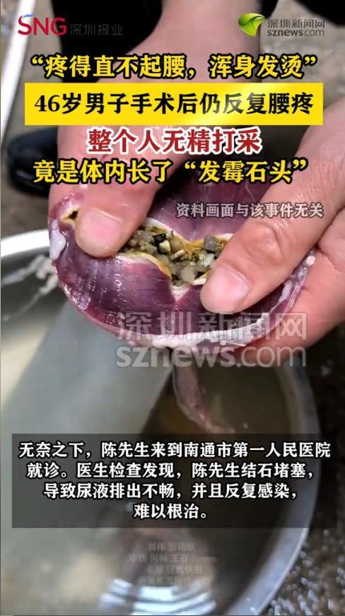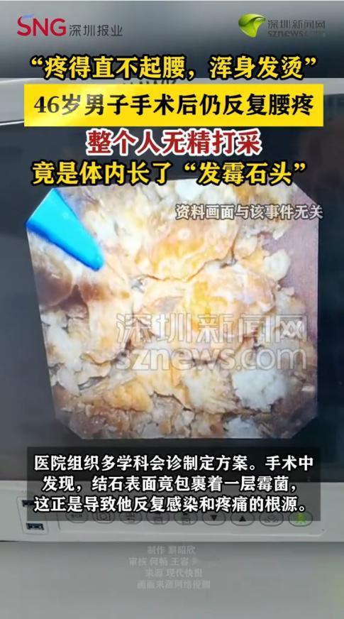 “开眼界了!”近日,江苏南通,一名46岁男子做完结石手术后仍反复腰疼,整个人无精打采,起初并没有在意,没想到三个月后竟直接疼得直不起腰、甚至开始浑身发烫。再次就医后竟检查出他体内长了一颗“发霉的石头”!网友:结石还能发霉? 都说结石手术做完就能恢复健康,但并不是所有情况都这么简单。有时看似成功的手术,背后可能还藏着更棘手的问题。 据媒体1月20日报道,前一段时间,陈先生总是感觉腰部疼痛,即便是吃了药贴了药膏也不见好。到医院检查后,才发现是左侧肾结石,于是在医生建议下做了输尿管软镜手术,希望可以摆脱肾结石的困扰。 术后他满心期待能恢复正常生活,可没过几天,腰疼就卷土重来,而且比之前更剧烈,整个人都无精打采的。本以为是术后恢复期,一家人也就没有在意,想着再养养看。 可是三个月后,陈先生疼得腰都直不起来,甚至伴随着浑身滚烫,持续高烧。家人赶紧带他到医院复查。医院随后组织了多学科专家会诊,这才发现他体内残留的结石表面,竟然包裹着一层厚厚的霉菌!正是这层霉菌导致了反复感染,让他的疼痛和高烧始终无法根治。 网友看后表示,这也太离谱了,结石都能发霉,身体里是长了个霉菌培养皿吗?还有人提醒,术后反复疼千万别硬扛,一定要及时复查,不然拖出大问题。 信息来源:《【46岁男子手术后仍反复腰疼竟是体内长了“发霉石头”]