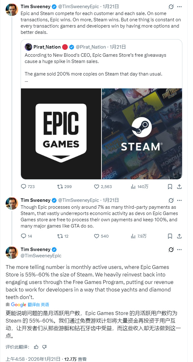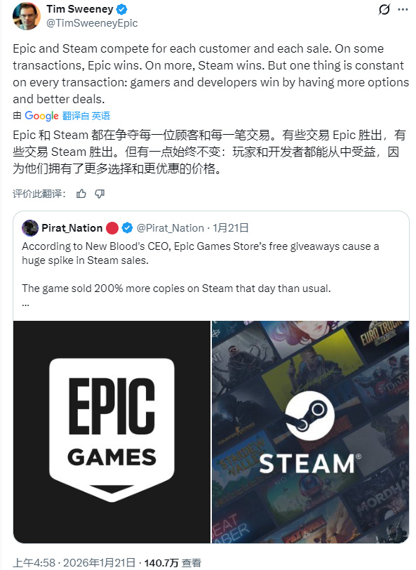 而在昨日,Epic总裁TimSweeney在推特上发言表示,在Epic,玩家和开发者都能从中受益,因为他们拥有了更多选择和更优惠的价格。
