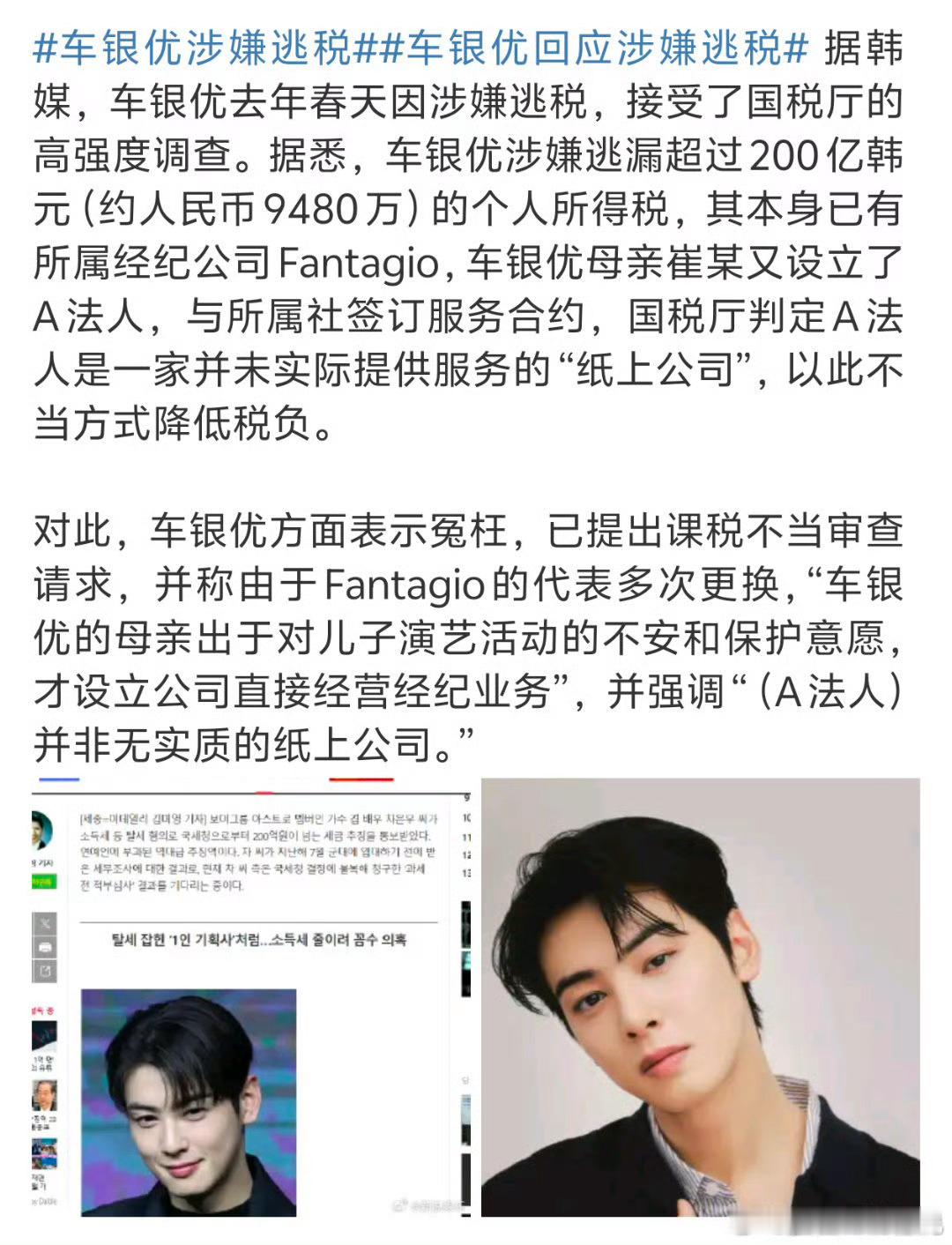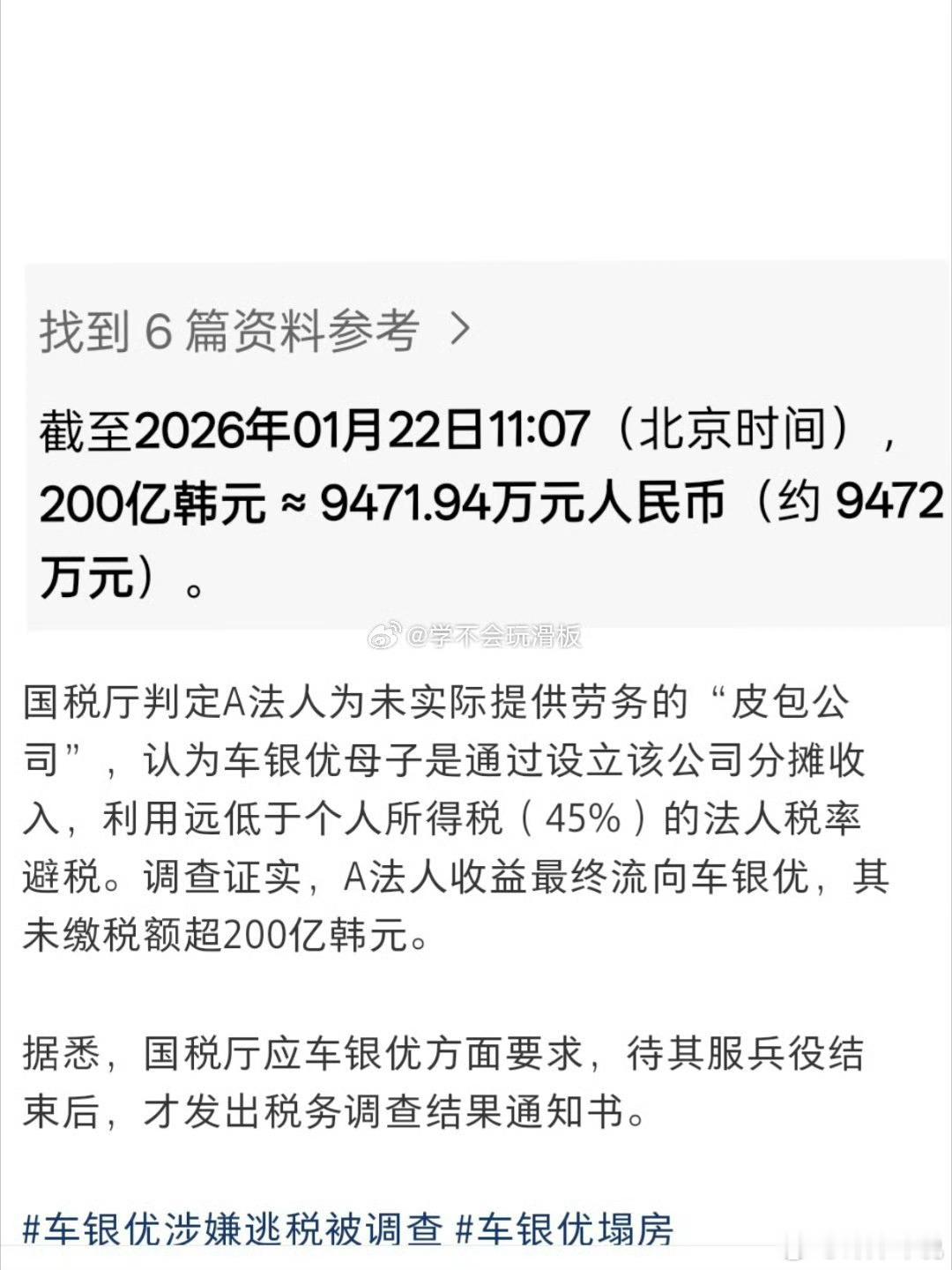车银优个人赚了500亿以上韩国国税厅认定A公司是一家“空壳公司”,车银优方强调“(A法人)并非无实质的纸上公司”