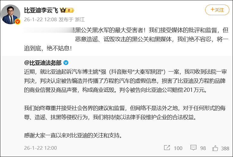 1月22日,比亚迪法务部发文表示,就比亚迪起诉汽车博主姚*强(抖音账号“大秦军陕团”)一案,公司近期收到法院一审判决,判决认定被告编造并传播了方程豹汽车的虚假信息,损害了比亚迪及方程豹品牌的商业信誉及商品声誉,构成商业诋毁。判令被告向比亚迪公司赔偿201万元。比亚迪方面表示,始终尊重并接受社会各界的建议和监督,但网络不是法外之地,对于任何形式的侮辱、造谣、抹黑等侵权行为,将持续以法律手段维护企业的合法权益。