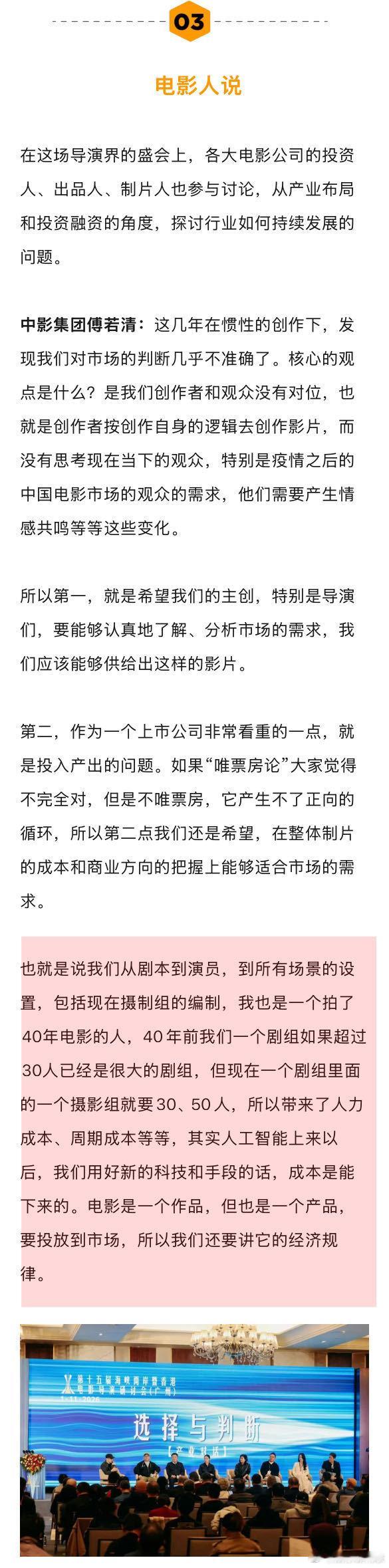王宝强说电影失败是导演的问题 华策说寻秦记的票房超出预期 在第15届海峡两岸暨香港电影导演研讨会上,中影集团傅若清谈道:“我也是一个拍了40年电影的人,40年前我们一个剧组如果超过30人已经是很大的剧组,但现在一个剧组里面的一个摄影组就要30、50人,带来了人力成本、周期成本等等,其实人工智能上来以后,我们用好新的科技和手段的话,成本是能下来的。”娱理独家↓