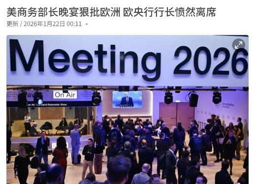 当场翻脸!在一个桌子上吃饭都吃不成了!1月22日,外媒报道了一则消息,那就是在世界经济论坛晚宴上,因为美国商务部长卢特尼克发表批评欧洲的演讲,欧洲央行行长拉加德愤而离席。知情人士透露称,晚宴约有数百人参加,包括所有主要成员、各国元首和其他政要。卢特尼克演讲时,有人现场起哄离席,而主办方不得不因此提前结束晚宴。   卢特尼克在达沃斯晚宴上那番话,不是临时起意的即兴发言,而是美国对欧战略转向的公开宣示。   这位商务部长选择在贝莱德CEO芬克主持的晚宴场合,当着数百名全球政商领袖的面,把私下谈判桌上的施压话术直接搬到台面上,本身就带着刻意挑衅的意味。   拉加德起身离席不是一时冲动,而是欧洲对美国长期累积不满的一次集中爆发——当盟友连表面尊重都不愿维持时,继续坐在那里听训话,反而成了对自身立场的背叛。   晚宴现场的氛围变化很有层次感。卢特尼克刚开始发言时,台下还保持着外交场合的礼节性安静。   他先是从能源政策切入,说全球应该重点发展煤炭而非可再生能源,这话已经让不少欧洲嘉宾皱眉头。   欧洲这些年把绿色转型作为核心战略,德国关停了最后一座核电站,法国投入巨资发展风电,现在美国商务部长公开说这些是"错误方向",等于直接否定了欧洲的产业政策。   但真正引爆现场的是他接下来的话——卢特尼克用轻蔑的语气评价欧洲的竞争力,说欧洲企业"缺乏创新活力""过度依赖政府补贴",甚至暗示欧洲的绿色能源转型是在"屈从于中国"。这话一出来,台下立刻响起议论声,有人开始交头接耳,有人摇头表示不认同。   拉加德当时坐在主桌附近,她原本低头看着餐盘,听到这里明显停顿了一下,抬头看了卢特尼克一眼。   据现场目击者说,她当时脸色已经不太好看,但还在克制。真正让她决定起身的是卢特尼克接下来的表述——他直接点名批评欧洲央行的货币政策,说欧洲的低利率政策"损害了美国企业竞争力",还暗示欧洲在贸易问题上"不够配合美国"。   这种公开场合对别国央行政策的指手画脚,已经突破了外交底线。拉加德和同桌的几位欧洲官员交换了眼神,然后直接推开椅子站起来,拿起手包就往外走。   她走得很干脆,没有回头,也没有和任何人打招呼。这个动作像信号弹一样,紧接着又有几位欧洲企业家和官员跟着离场,现场顿时一片混乱。   主办方芬克试图打圆场,呼吁大家保持冷静,但场面已经控制不住了。美国前副总统戈尔在台下直接发出嘘声,有人开始大声反驳卢特尼克的观点。   晚宴原本计划进行到晚上十点,结果提前半个多小时就草草收场。事后有参会者形容,那场面"像一场精心准备的羞辱仪式",卢特尼克不是来对话的,是来下最后通牒的。   这场冲突的根源,得从特朗普政府重返达沃斯的背景说起。2026年1月的达沃斯论坛,特朗普带着史上最大规模的美国代表团参会,商务部长、财长、贸易代表全来了,摆明了不是来谈合作的,是来展示肌肉的。   来之前美国已经对欧洲八国发出关税威胁,理由是这些国家反对美国"购买"格陵兰岛。这种用贸易手段施压领土问题的做法,在国际关系史上都罕见。卢特尼克在晚宴上的发言,其实就是把关税威胁背后的逻辑公开化——美国认为欧洲"不听话",需要敲打。   拉加德的反应也不是临时起意。她在达沃斯论坛前几天接受法国媒体采访时,就已经明确表达对美国政策的不满。   她说美国"作为盟友表现得非常奇怪",当了几十年北约伙伴,突然威胁要夺取格陵兰岛,这不像盟友该有的行为。   她还警告说,如果美国继续这种反复无常的政策,欧洲需要重新审视与美的关系。所以晚宴上的离席,是她个人立场的延续,也是欧洲对美国政策集体不满的象征性表达。   有意思的是,这场风波发生后,美欧双方的表态都很微妙。美国商务部事后回应说"只有戈尔一个人发出嘘声",试图淡化事件影响。欧洲央行则拒绝评论拉加德是否离席,只说"行长有权利表达自己的立场"。   这种低调处理背后,其实是双方都不想把事情闹大——美国还需要欧洲在乌克兰、中东等问题上配合,欧洲也不想彻底撕破脸。但裂痕已经摆在那里了,晚宴上的尴尬场面,不过是美欧关系现状的一个缩影。   从更宏观的角度看,卢特尼克和拉加德的这场冲突,反映的是跨大西洋关系正在经历结构性调整。美国想用"美国优先"的逻辑重塑国际秩序,欧洲则试图维护多边体系和规则。当这两种理念在达沃斯这个象征全球合作的舞台上正面碰撞时,连一顿饭都吃不下去,也就不奇怪了。   官方信源及发布时间:英国《金融时报》报道《美国商务部长言论引发达沃斯晚宴混乱》(2026年1月21日)
