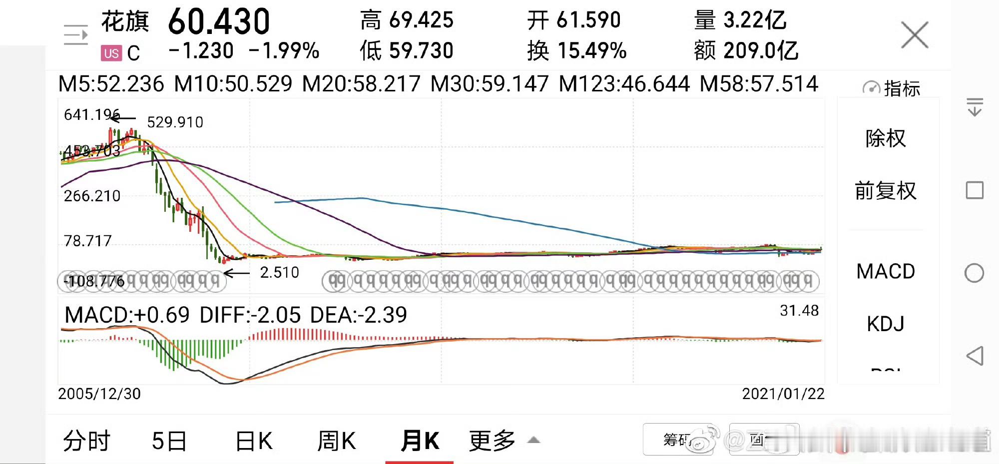 全文转:今天两个群的群友们都在讨论杠杆与风险,我就发了一个亲身经历的事。历历在目,血腥惨烈。花旗银行是美国股市标准的蓝筹股。长期每年四次分红。2007年最高500多美元,2008年底至09年初,最低跌到1.8美元附近。金融危机前我犹豫了好久还是没买,10多年过去,依然心有余悸。仿佛一粒子弹贴着我的头皮,穿过我稀疏的头发。我的一位朋友就没那么幸运,他做房产的,多年投资花旗,这次当花旗跌到50块左右时,他认为到底了,先再投入120万美元开始买入,到30元时开始加杠杆,还劝我和他一起买。说一定会赚钱,最后花旗从高点跌了90%后,再跌95%。这个朋友在这个过程中追加保证金,卖房子再补,最后被平仓,血本无归。从此不再碰股票。有十年了,再没见过他。不知道现在怎样。他如果不加杠杆,本还有一部分在,所以什么都可能,也都会发生,只是不知道什么时候发生。谁会遇到。我希望有一天如果我遇到,(其实已经遇到过跌70%多的时候了。)我依然会坦然面对,有一口气,爬着也要爬出黎明前的黑夜。在投资上,我对风险极端厌恶,并且极端恐惧。拿一点风险换无数的利益,我也不愿意。变富需要一生,而冒险带来的灭亡,只需要一瞬间。 深圳·不藏咖啡