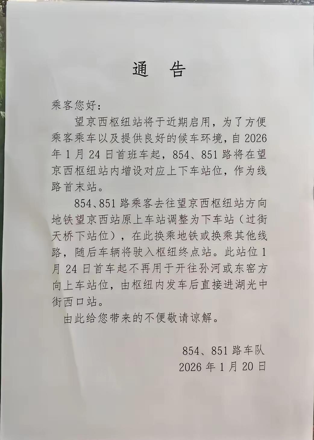 告诉大家一个好消息,备受大家关注的17号线望京西站枢纽将于本周六(1月24日)正式投入运营! 届时,乘客可在此实现17号线与13号线、15号线的三线换乘,北部城区通勤压力将得到极大缓解。 公交接驳同步升级,从1月24日首班车起,854路、851路公交将在望京西枢纽站内增设上下客点位,并以此作为线路首末站。 乘客可从地铁出口直接进入枢纽站内换乘公交,无需再走到路面站点,大幅提升了换乘效率。地铁天通苑 地铁天通苑站 北京十八号地铁 17号线东延伸 16号线二期 17号线望京西