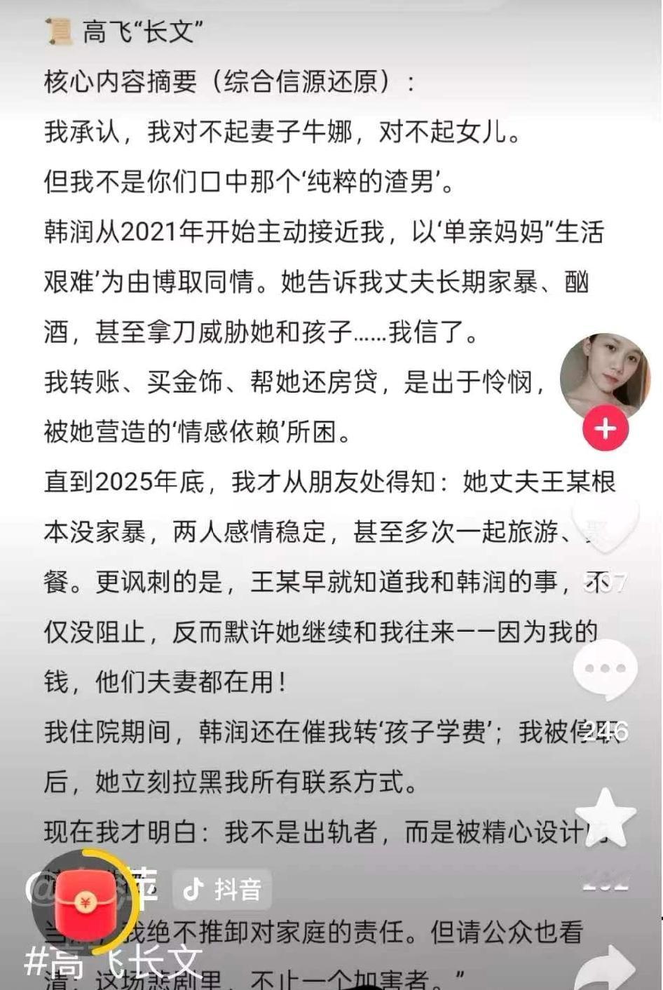 人财两空,还惹一身骚!高飞被韩润和丈丈连手耍的团团转,他现在发长文讲述与韩润的“爱情故事”他给韩润的钱不止80万元,而是137万元。 高飞偷鸡不成蚀把米,这把米有点多137万元,被韩润夫妇到处旅游花光了。 这反转也太刺激了,短剧都不敢这么拍吧,上一秒男主以为自己遇到真爱了,抛妻弃子,结果发现自己是个二哈!帮别人养了老婆、孩子,人家乐的清净。