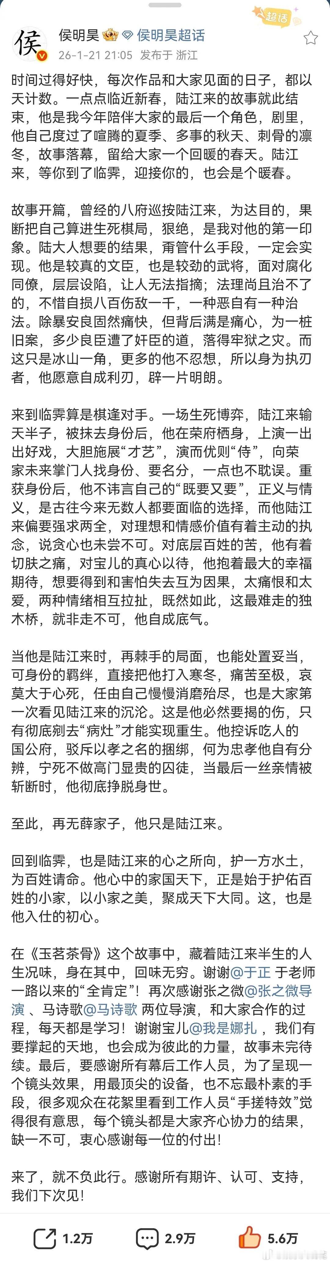 《玉茗茶骨》侯明昊收官文来了!小侯写得好真诚啊!收官文都是自己的真实感受每一笔每一段文字的用心侯明昊《玉茗茶骨》把🥭送回cvb卫视第一!这是真的太有效播剧了吧无大厂无大IP无大yx,全靠自己以小博大每一步都算数!真的是生粉天堂了!