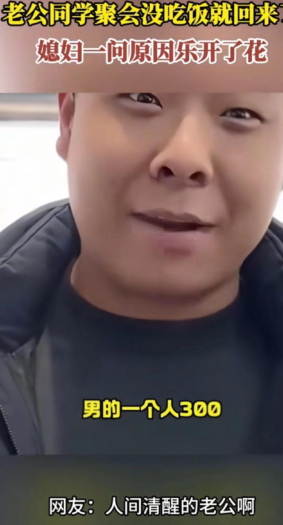 干得漂亮!河北,一男子去参加同学聚会,可是他连饭都没吃就回来了,妻子问他早回的原因,男子:“男的300,女的免费。我一听就觉得这样的聚会没意思,当我傻啊?用那300给媳妇买点吃的,还能让媳妇高兴一下。”网友:这才是人间清醒! 那天,大哥在班级群里看到聚会的消息,心想老同学好久不见,去叙叙旧挺好,就爽快报了名。到了聚会那天,他特意换了身衣服,跟老婆打好招呼出了门。 可谁能想到,他人是到了,聚会却“变味”了。还没进门,就看到有同学在门口“记账”,明确说了这次聚会“男的AA,300一位;女的免费”。 这句话像一盆冷水,把大哥心里的热情全浇灭了。这哪是单纯的同学叙旧啊?这不成了一种“强制消费”吗?凭什么男的就该当这个“冤大头”? 大哥心里顿时不是滋味。他冷静一想:花300块坐那儿,听一堆人吹牛、炫耀、攀比,说不定还弄得自己心里不舒服,图个啥? 这钱花得冤不冤?与其花钱买不痛快,不如把钱花在疼自己的人身上。 他立马做了决定:这聚会,不参加了! 他转身就去了水果店,媳妇平时念叨想吃但嫌贵的榴莲、草莓,他眼都没眨就买了一大袋。提着水果回家,老婆都惊呆了。听完他的理由,老婆笑得合不拢嘴,直夸他做得对。 这事儿在网上炸开了锅, 认为“人间清醒”派:绝大多数网友都力挺这位大哥!他们说:“这大哥太明智了!”“这不是抠门,这是看透了!”“花300给老婆买高兴,比看人显摆强一万倍!” 认为“格局小了”派:也有少数人说大哥小题大做,看重钱伤了同学情分,认为他“格局小”、“没朋友”。 认为“规则不公”派:更多人把矛头指向了聚会的“潜规则”,认为“男女平等,凭什么男的出钱女的免单?”“这种聚会早变味了,不去也罢!” 要我说,我举双手双脚支持这位大哥!他哪里是“格局小”?他简直是“活得通透”!现在的很多同学聚会,早就不是当年的纯真模样了。 多少聚会变成了炫富场、攀比台,混得好的高谈阔论,混得普通的默默埋单,最后吃也吃不好,心情更糟糕。 他清醒地知道,谁才是自己生命中最重要的人。那300块钱,在聚会上可能连个水花都溅不起,但给媳妇买成水果,却能换来家人真心的笑容和家庭的温暖。 这笔账,他算得明明白白!这不是小气,这是把有限的金钱和情感,用在了最值得的“刀刃”上。 那些说他的人,可能只是不好意思承认,自己也曾在这种场合当过“冤大头”罢了 大哥用一次转身,守护了自己的钱包,更守护了家庭的幸福感。他让我们看到,真正的智慧不在于合群,而在于懂得选择。选择把时间和金钱,倾注在那些真正爱你、值得你珍惜的人身上。