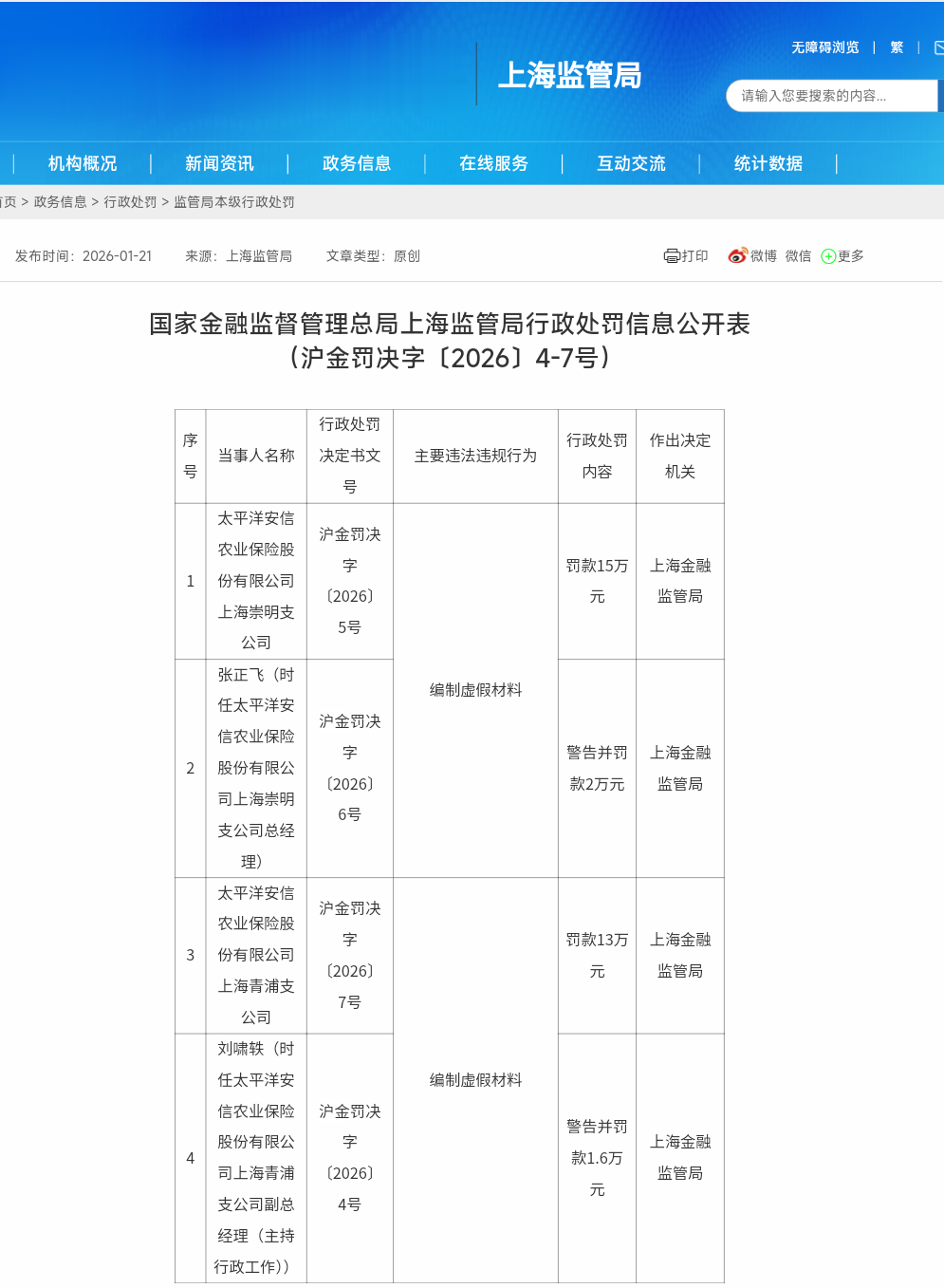 1月21日,国家金融监督管理总局上海监管局公布行政处罚决定,太平洋安信农业保险股份有限公司(简称“太平洋安信农险”)上海崇明支公司、青浦支公司因存在编制虚假材料的违法违规行为,分别被处以15万元、13万元罚款,两家机构合计罚款28万元。时任两公司相关负责人分别被给予警告并罚款2万元、1.6万元。