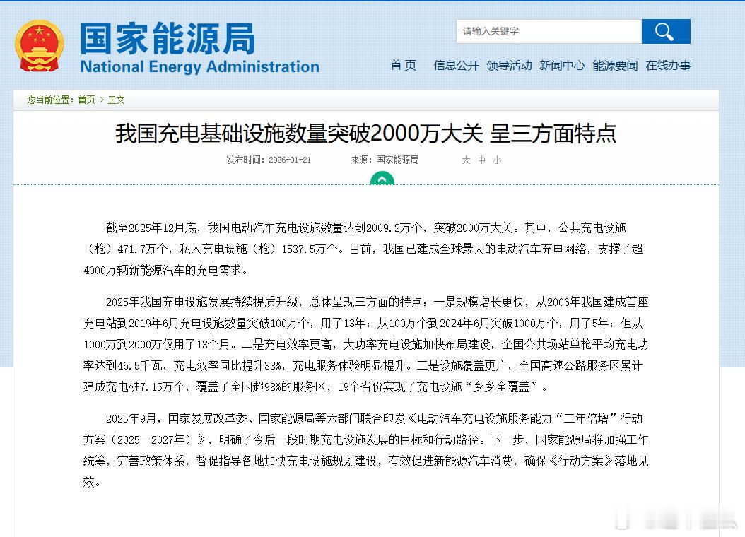 我国成为最大电动车充电大国!根据昨日国家能源局官网宣布,截至2025年12月底,我国电动汽车充电设施数量达到2009.2万个,突破2000万大关。其中公共充电桩471.7万个,家用个人的1537.5万个,已经建成全球最大的电动车充电网络。说起来实在感概,我国从建设第一座充电站至今,不过20年时间。我们并非奠基人,但我们用“中国速度”和强大的基础设施建设布局能力,将充电服务普及到每一个土地,超98%的服务区,成为当之无愧的全球之最。2027年底建成2800万个充电设施