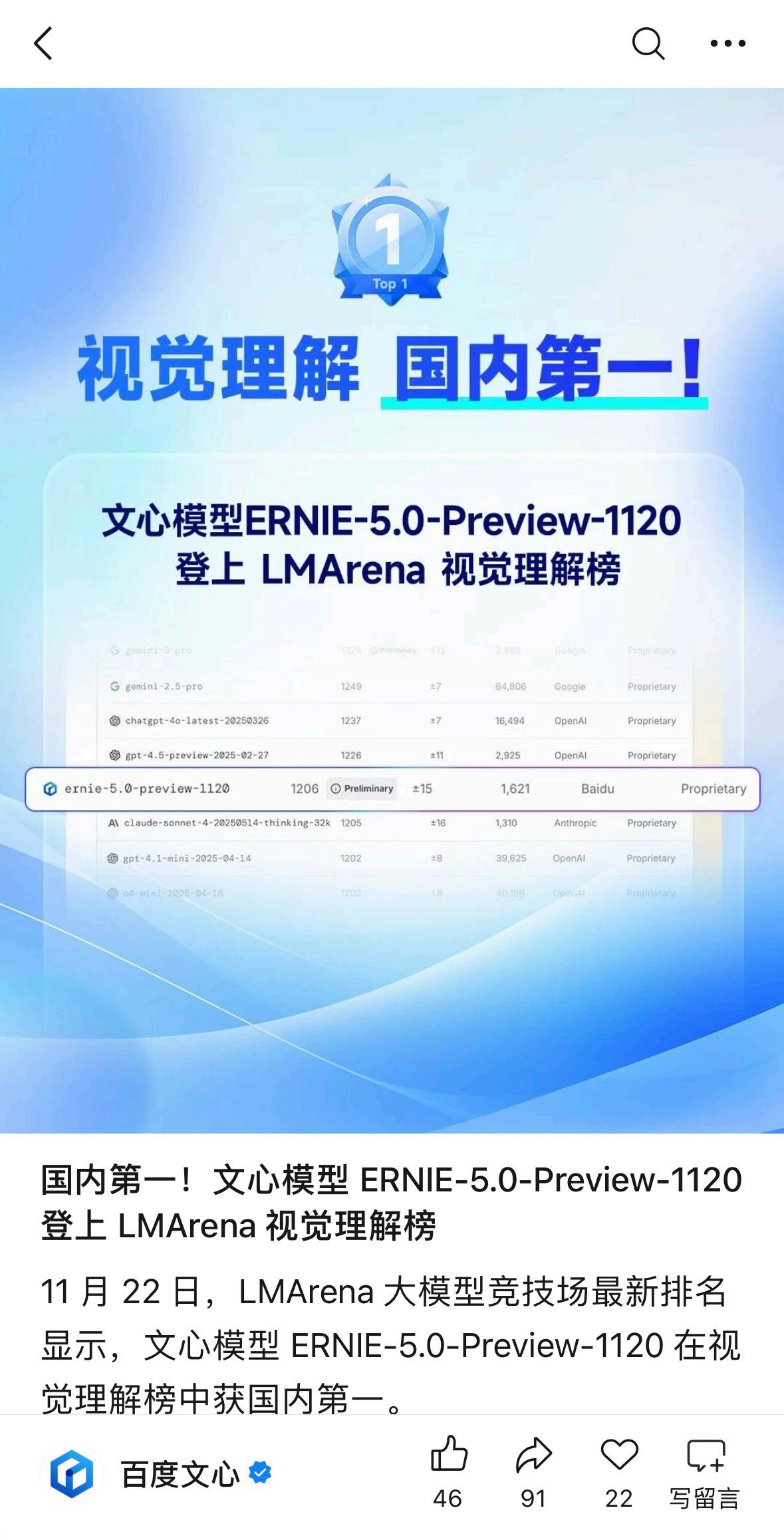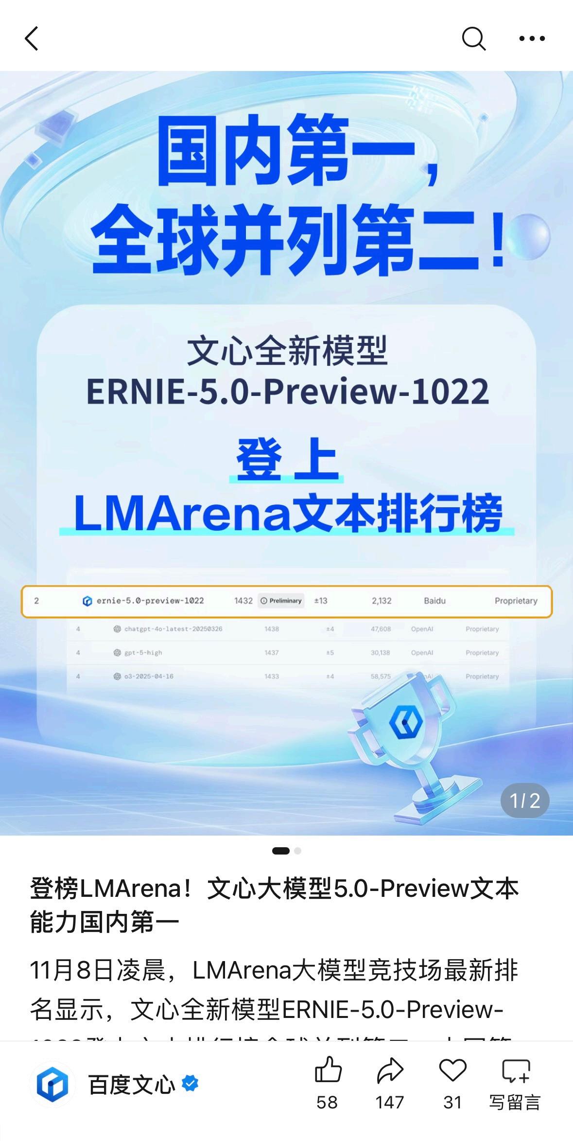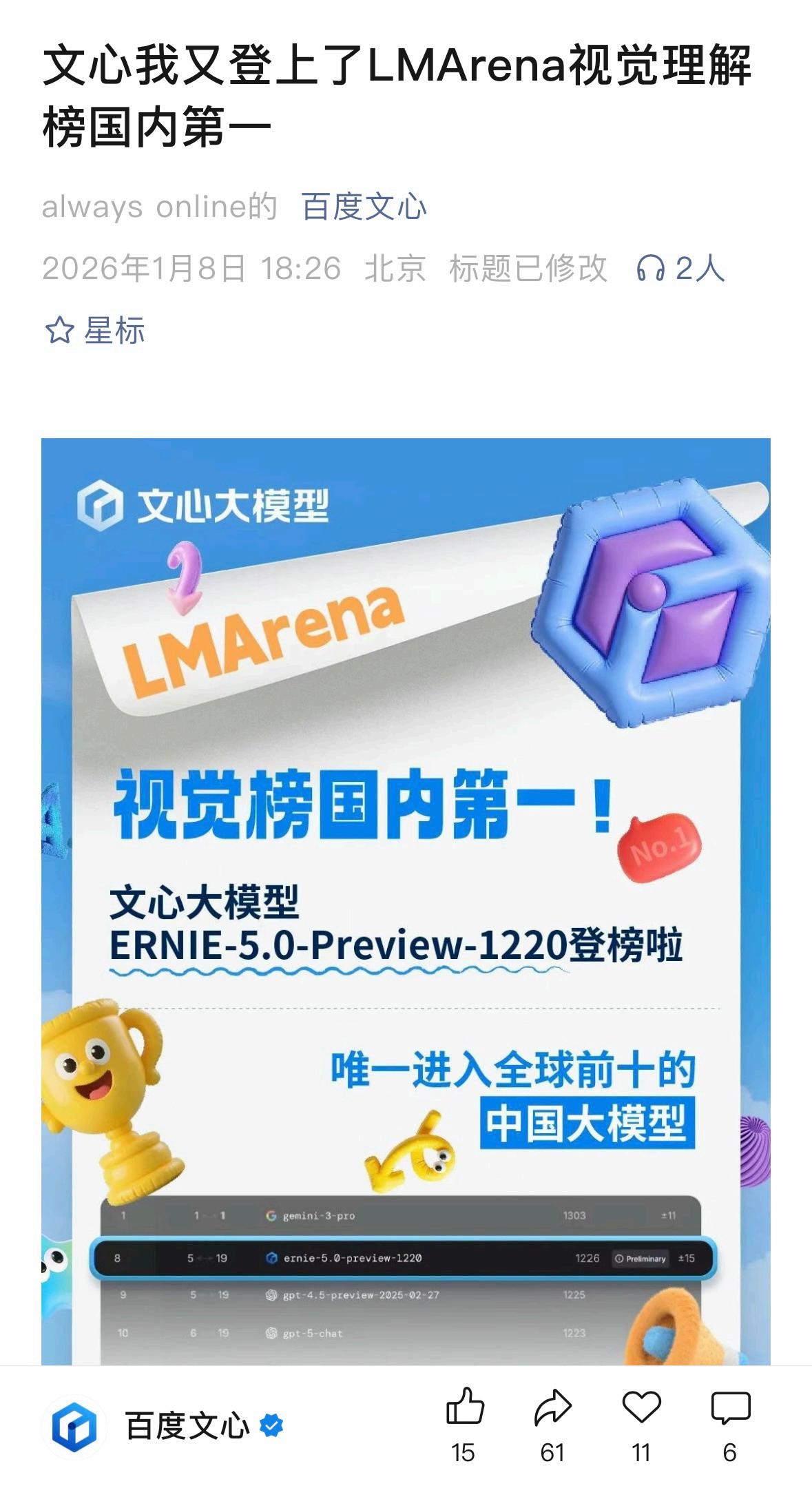 【从技术巅峰到亿级用户,文心5.0正式版如何撑起它的“高光时刻”?】 2026年开年,国内大模型赛道最亮眼的仔,非文心莫属。前几天文心APP的MAU(月活跃用户)刚刚突破2亿大关,就在大家猜测百度下一步会有什么动作时,1月22日,文心5.0正式版重磅发布。这一套组合拳打下来,节奏感极强,明显能感觉到文心正在从技术积累期走向全面的爆发期,走势明显升高。 在正式官宣之前,文心其实已经“低调”地秀了一把实力。关注大模型评测的朋友可能注意到了,文心近期频繁在LMArena登榜。无论是在文本还是视觉理解榜单中,它都多次卡位国内第一,并且是唯一进入全球前10/20的中国大模型。 这种在全球第一梯队里站稳脚跟的表现,为文心5.0的发布做足了铺垫。而这次正式版揭开面纱,更是抛出了王炸:2.4万亿参数规模,以及真正的原生全模态技术。 为什么说文心5.0很有可能拉开差距?因为它解决了一个核心痛点:多模态的割裂。不同于业内常见的“拼凑型”多模态,文心5.0采用原生全模态统一建模技术。在40余项权威基准评测中,它的语言与多模态理解能力已经超越了Gemini-2.5-Pro和GPT-5-High。这意味着,那个大家熟悉的“最强文科生”,它不仅能写,还能看、能听、能画,而且是在一个模型框架内协同完成,效率和效果都大不一样。 对于用户和开发者来说,好消息是文心5.0并非“期货”。目前个人用户已经可以在文心APP体验,企业也能通过千帆平台调用。其超大规模混合专家结构带来的低激活参数比,保证了它在变聪明的同时,推理效率依然在线。 从LMArena的高频登榜,到用户规模的突破,再到如今文心5.0携2.4万亿参数正式落地,百度这一波操作逻辑非常清晰:用硬核技术承接庞大的用户需求。