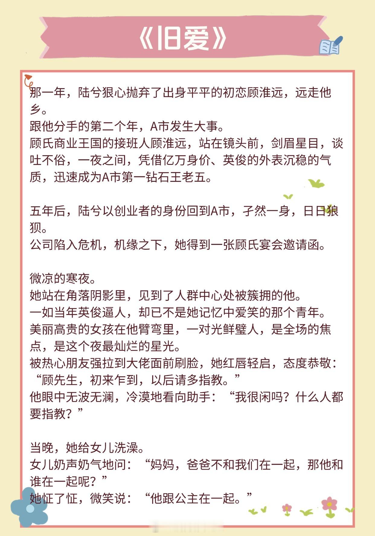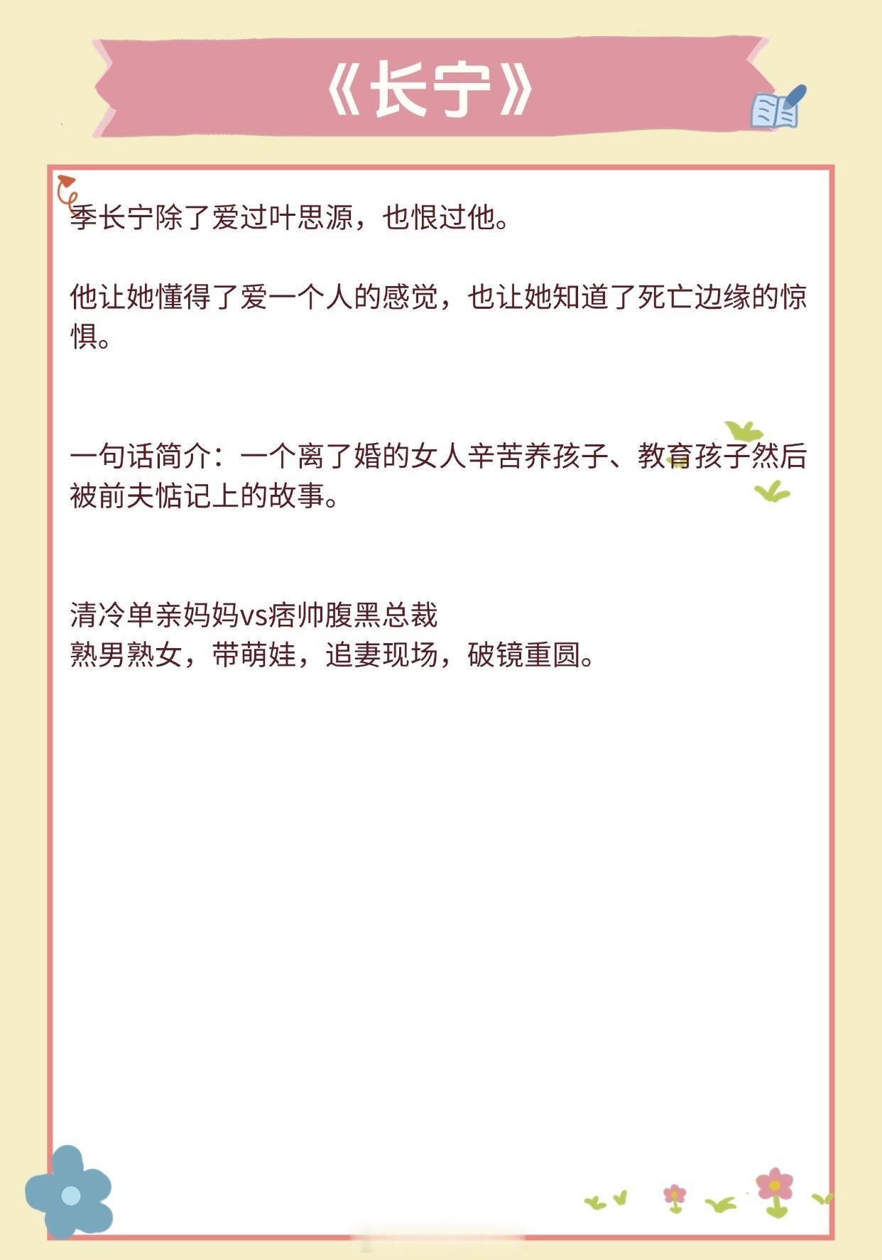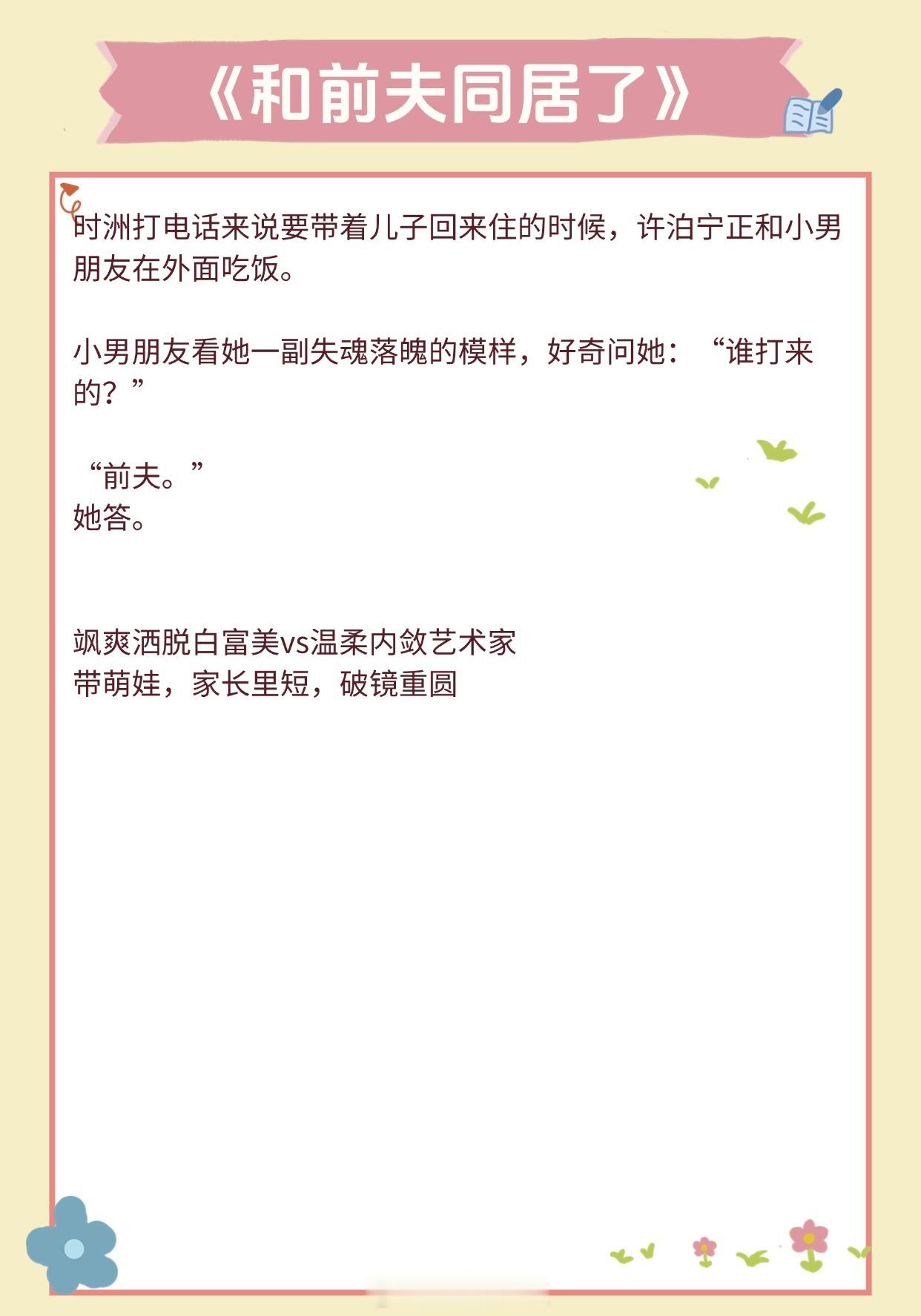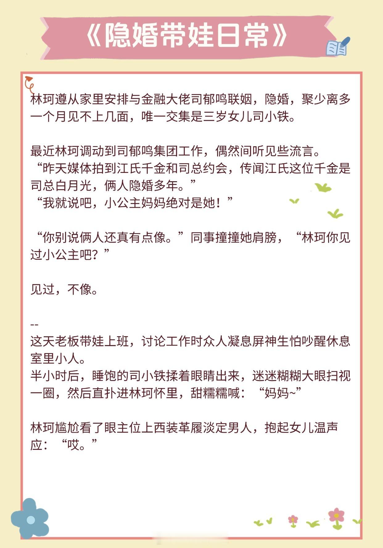 【超甜养崽文】他让她懂得了爱一个人的感觉《隐婚带娃日常》作者:苏其《豪门前男友非要当孩子爸爸》作者:赵史觉《旧爱》作者:关就《暴雨骤歇》作者:江言之《和前夫同居了》 作者:林春令《橘子发芽了》作者:夏诺多吉《长宁》作者:潇茫《你好,周先生》作者:夜蔓《公主病观察日记》作者:铁扇公子推文言情小说推荐推文