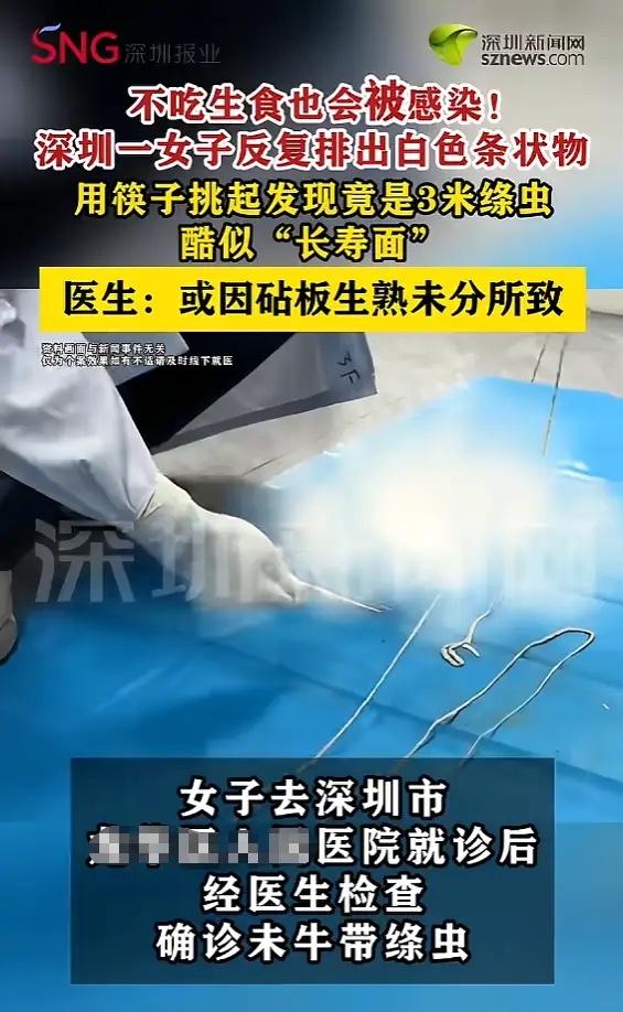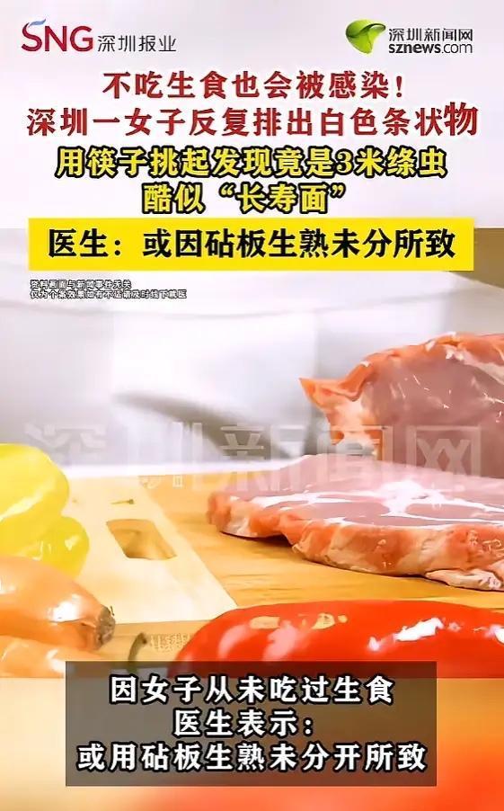 广东深圳,一女子平时特别注意饮食卫生,从来不吃生食,可最近上厕所,却反复排出白色条状物,当医生用筷子挑起排出的虫体,才知道这是一条绦虫,并且有3米长!而原因,家中菜板生熟未分导致的!网友:头皮发麻! 张女士住在龙华区,平时饮食格外小心,吃火锅必定烫到全熟,牛排也只吃全熟的。但最近三个月,她发现排便时偶尔会排出白色会动的条状物,长的时候能绕马桶一圈。直到前两天排出一条长达3米、形似“长寿面”的活虫,她才急忙前往深圳市龙华区人民医院就诊。 接诊的感染性疾病科医生谢柳用筷子挑出虫体,确认这是牛带绦虫。张女士十分困惑,自己从不吃生食,怎么会感染?医生详细询问生活习惯后发现张女士家中只有一块砧板,老人做饭时切完生肉简单用开水冲烫后就继续切水果或熟食。开水烫洗并不能有效杀死寄生虫卵。 砧板生熟混用是一个很大的健康隐患,生肉中可能携带的绦虫幼虫或虫卵会通过刀和砧板污染熟食。人摄入被污染的食物后,虫卵在肠道内发育为成虫,可引起腹痛、腹泻、营养不良等症状,牛带绦虫成虫可以寄生于人体肠道。 家庭里最好配备两块以上砧板,分别处理生食和熟食。处理生食后,砧板需彻底清洗并保持干燥。肉类务必煮熟煮透,蔬果要洗净。养成良好的个人卫生习惯,如饭前便后洗手等。 厨房里的每一个细节都关乎健康,砧板生熟分开、餐具彻底清洗、肉类充分加热,日常下厨时多一份留心,就能有效减少病从口入的风险。 各位读者你们怎么看?欢迎在评论区讨论。