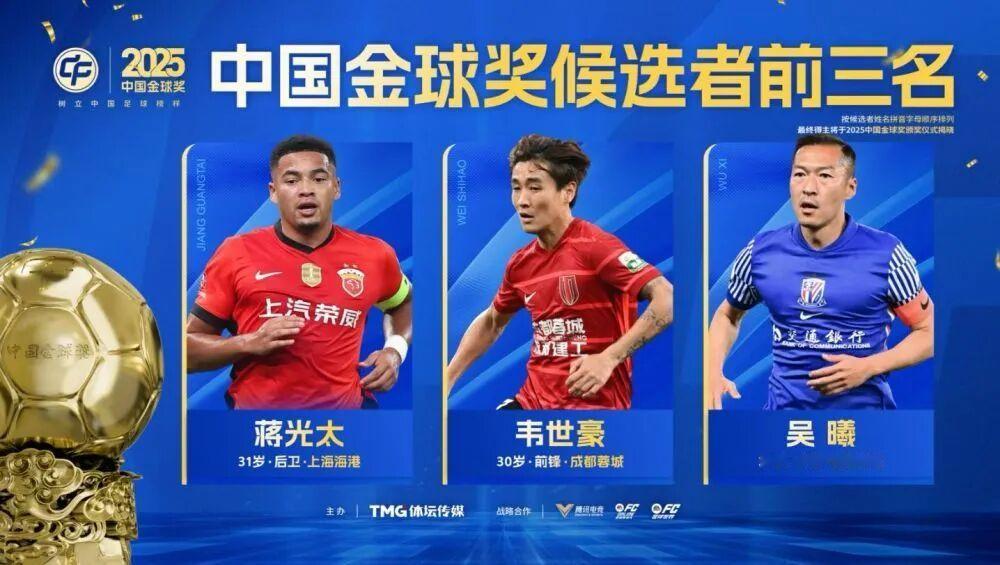 2025中国金球奖候选人前三名名单22日公布,吴曦、蒋光太和韦世豪入围。评选中,