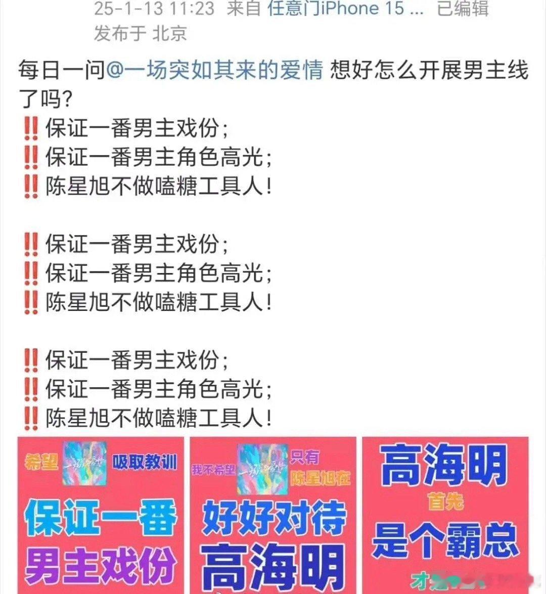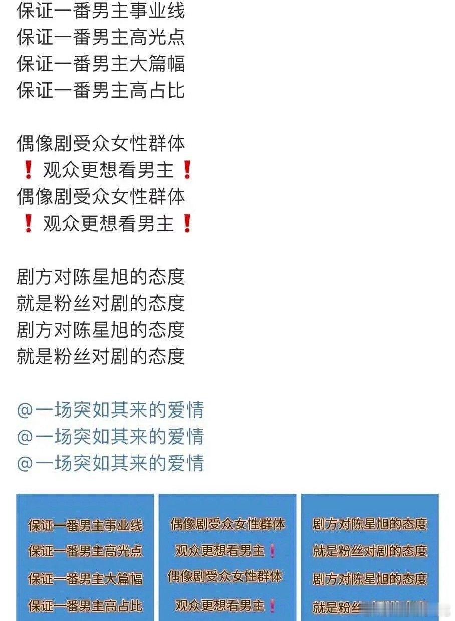 陈星旭和王玉雯新剧有单恋女主的男二吗刷到陈星旭粉丝在维权和王玉雯的新戏,要保证男主的戏份,强调了一番男主的事业线记得陈星旭家不是第一次了,《轧戏》也是一样的维权,所以现在作为主角粉丝是不是要时常敲打