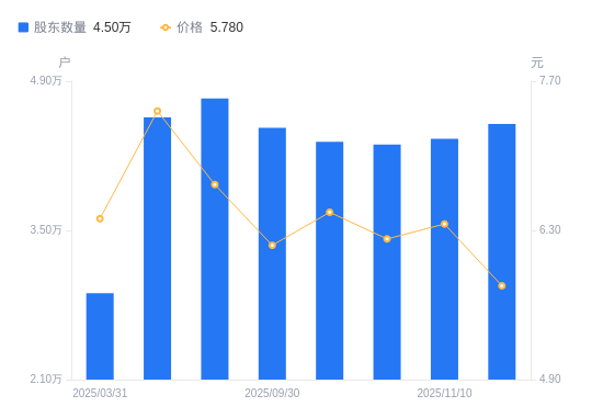 日期A股户数(户)流通A股户均持股数(股)户均持股市值(万元)2026-01-094400425264.9813.972025-11-284497924717.3114.292025-11-104360822704.0914.442025-10-314305622995.1714.302025-10-204332422852.9314.792025-09-304462122188.6613.672025-08-294738920892.6214.062025-06-304560221711.3316.112025-03-312910034023.2821.812024-12-312665137149.7322.18