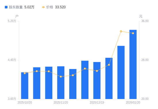 日期A股户数(户)流通A股户均持股数(股)户均持股市值(万元)2026-01-205021810394.2434.842026-01-094693111122.2437.722025-12-314447111737.4931.732025-12-194360311971.1530.852025-12-104386211900.4631.242025-11-284215912381.1730.802025-11-204271812219.1630.062025-11-104265312237.7831.442025-10-314251012278.9431.582025-10-204149112580.5131.83