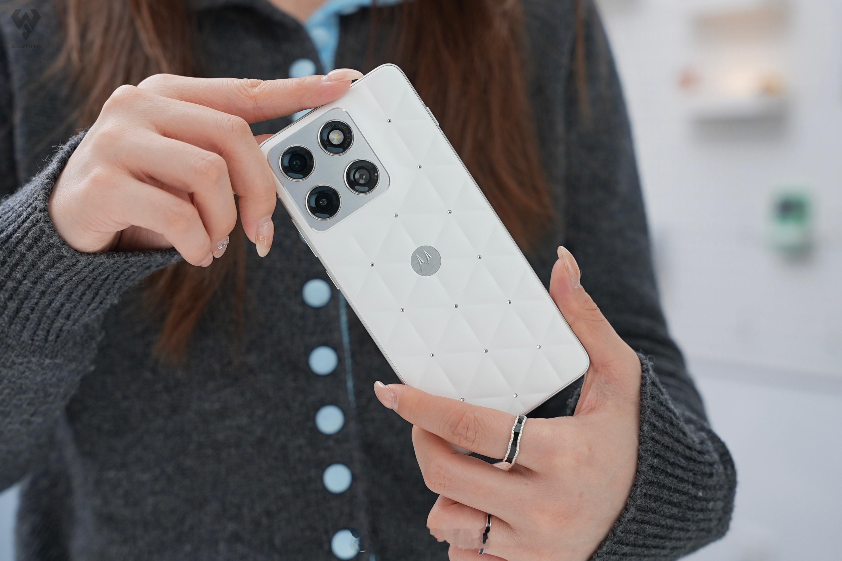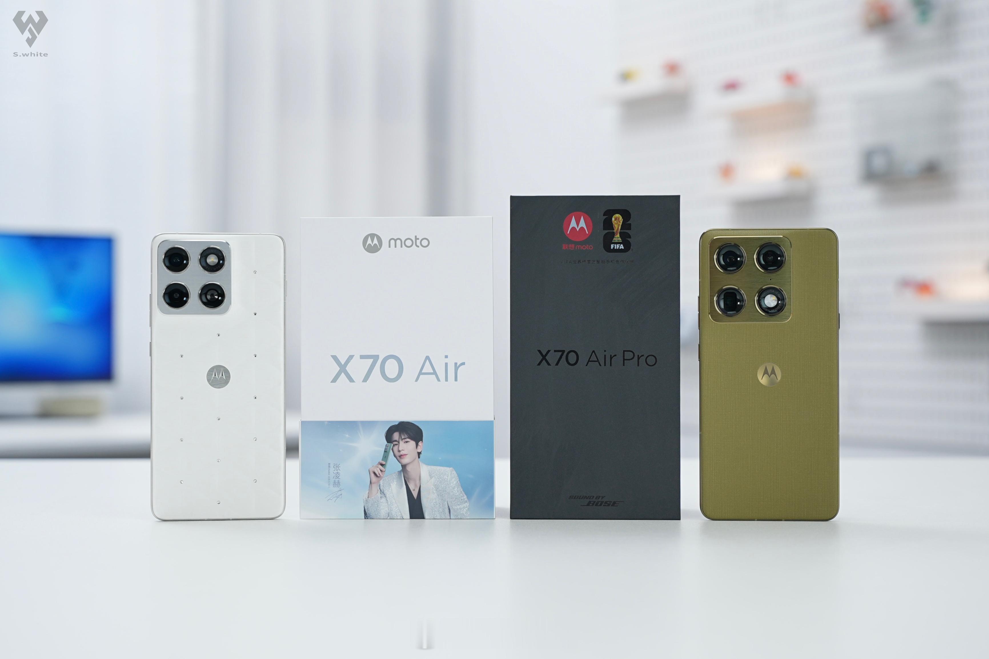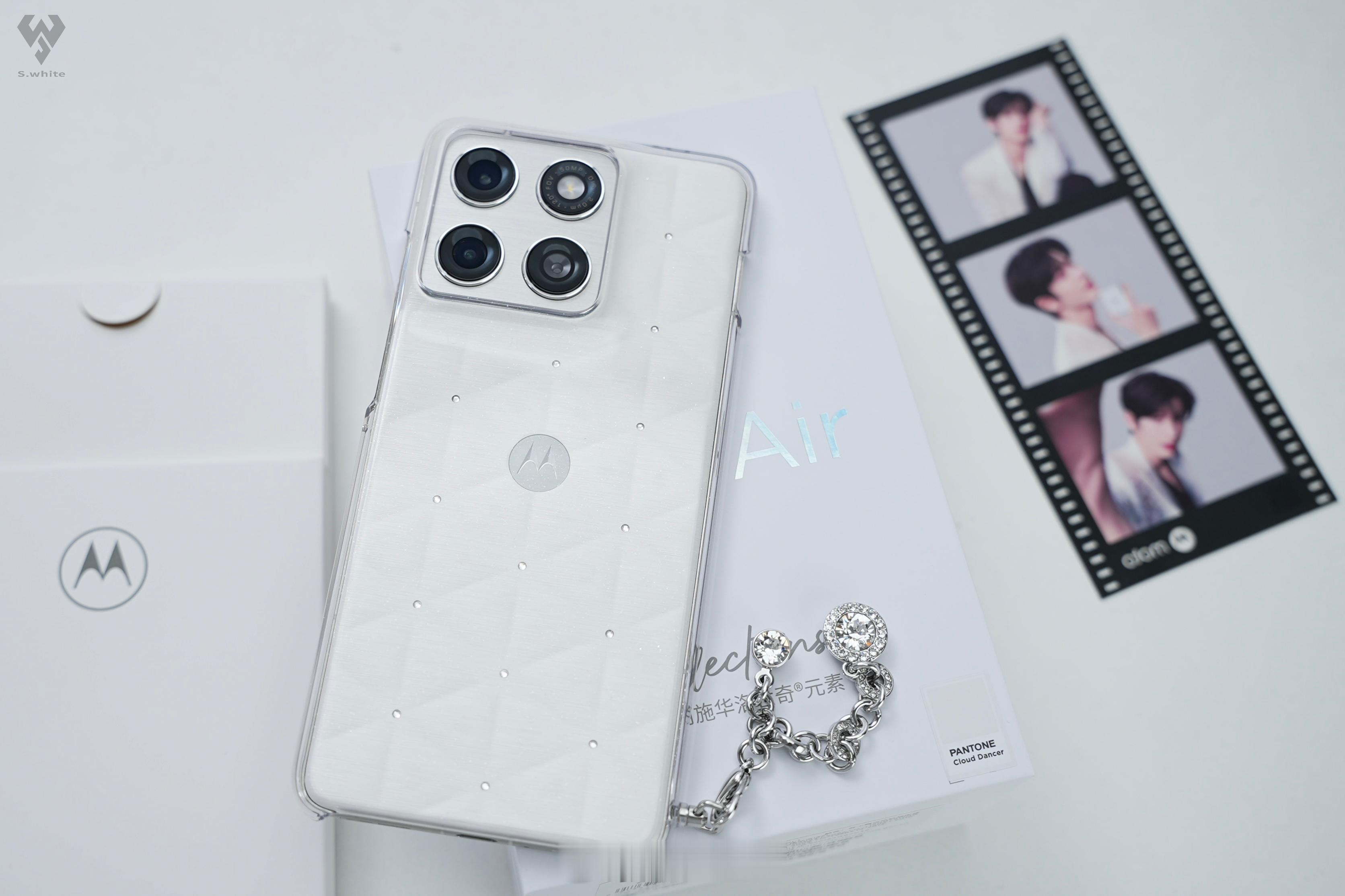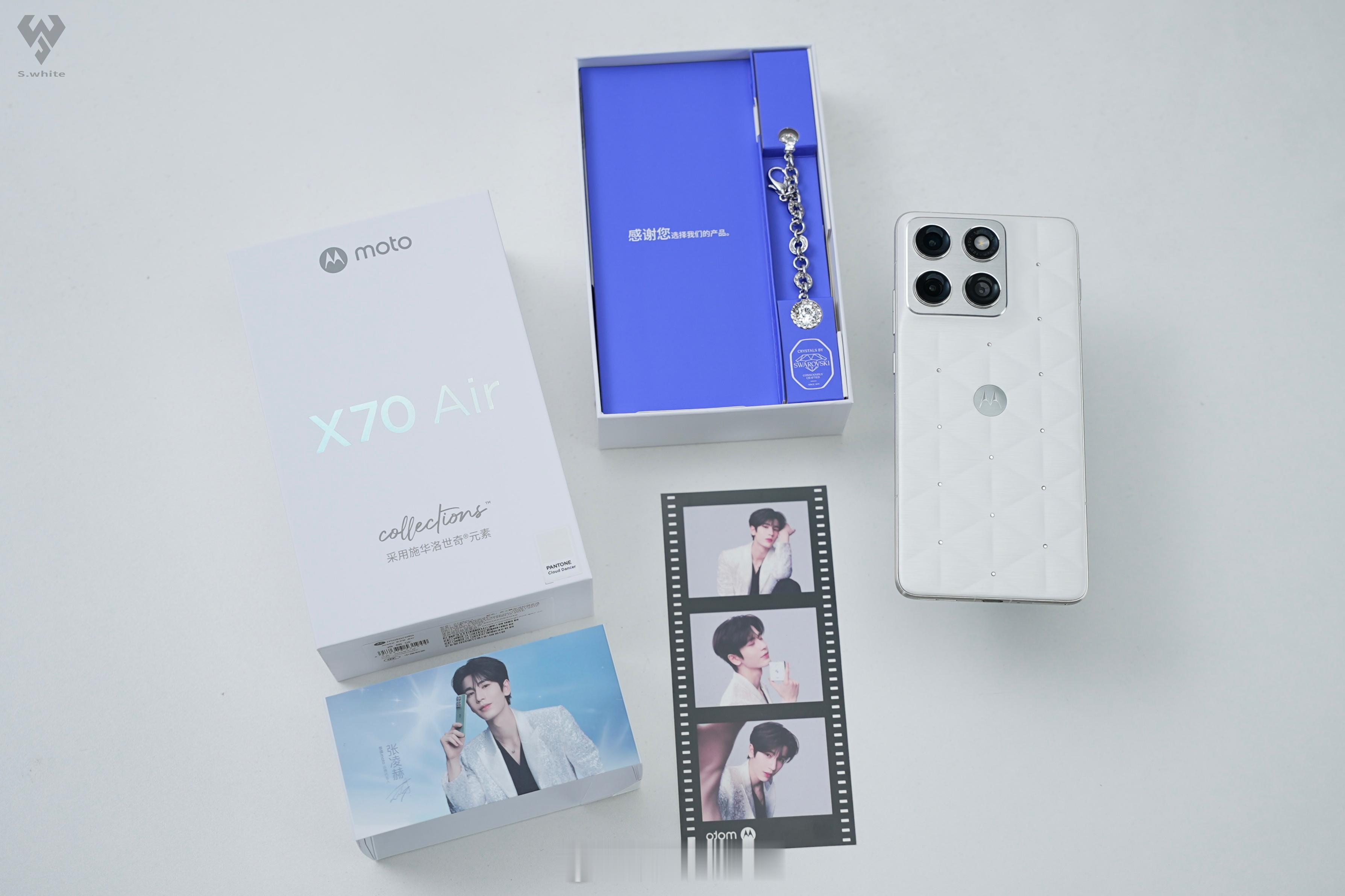 moto两台Air真机实拍moto X70 Air云上舞白·冰钻限定版设计有点意思,后盖像是那种小香风的白色荔枝压纹包包,点缀了一些碎钻装饰,5.99mm/159g;moto X70 Air Pro影像和性能更Pro,有颗潜望长焦,6.99mm/186g,后盖说是山羊绒西服质感。两台手机都是潘通定制色,中框比较特别,做了拉丝,6.7英寸大小,电池虽然小一些,但手感还不错,手机里面还有不少代言人张凌赫的元素,比如照片水印、壁纸、铃声,拍照色彩风格里还有个张凌赫参与的“凌境时光”私人格调模式,今天天气不好还没来得及拍。大家觉得摩托罗拉这两台Air怎么样?小白测评