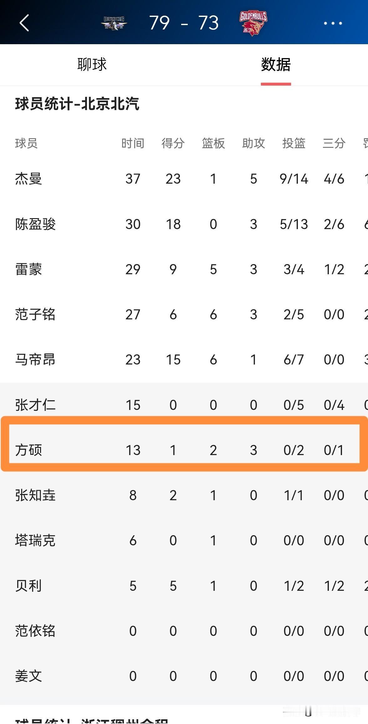 北京北汽老将方硕的拼搏精神真是太让人感动了!在今天北京北汽主场以79:73力克浙江稠州金租的比赛中,方硕怒摔保温杯,他在攻防两端都拼劲十足。全场比赛下来,方硕替补出战13分钟,投篮2中0,其中罚球2中1得到1分2篮板3助攻2抢断2盖帽,他的场上正负值为+11。 实事求是的说,本场比赛是方硕自本赛季开赛至今拼劲最强的一场比赛,看得我热泪盈眶。
