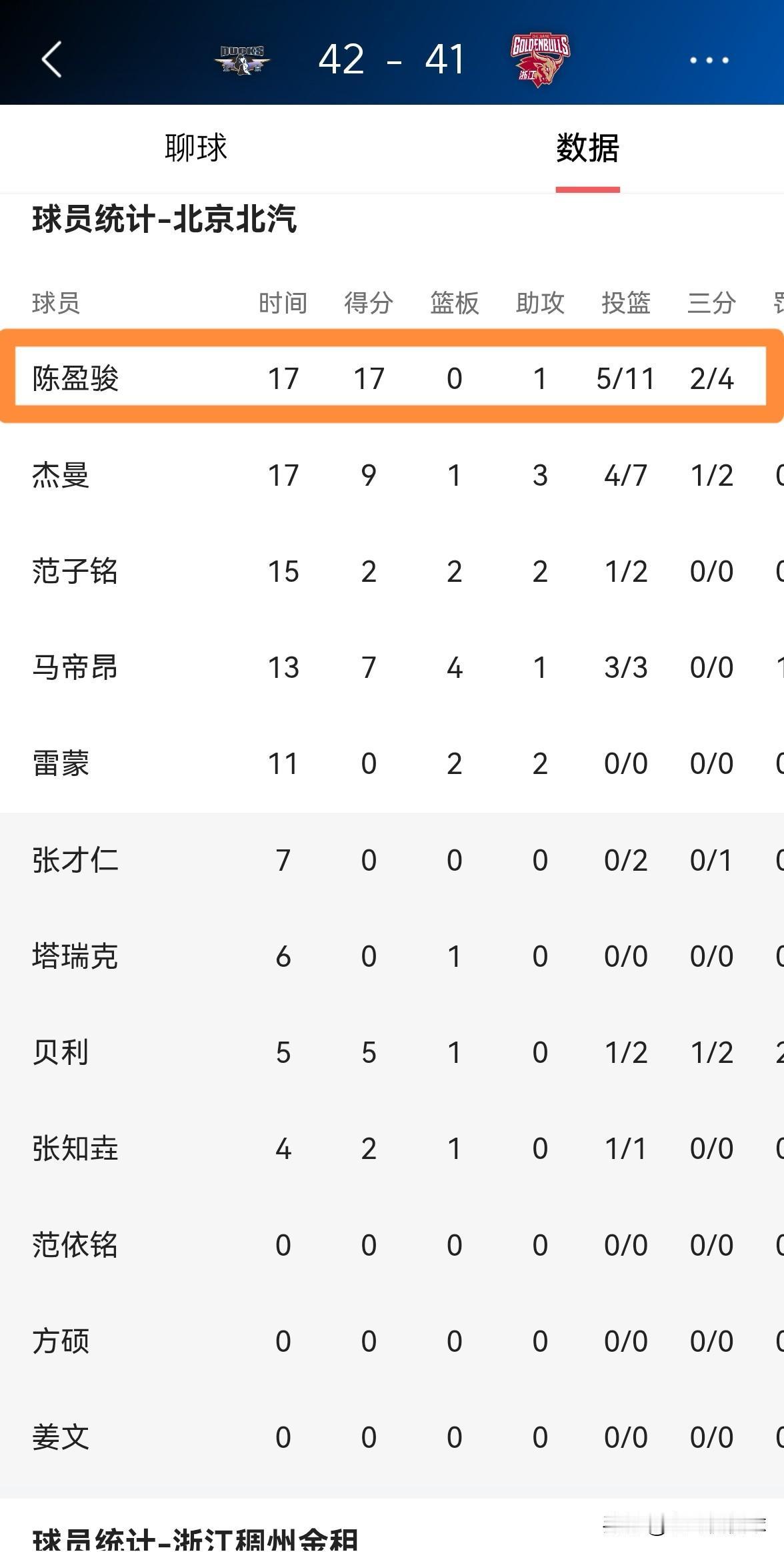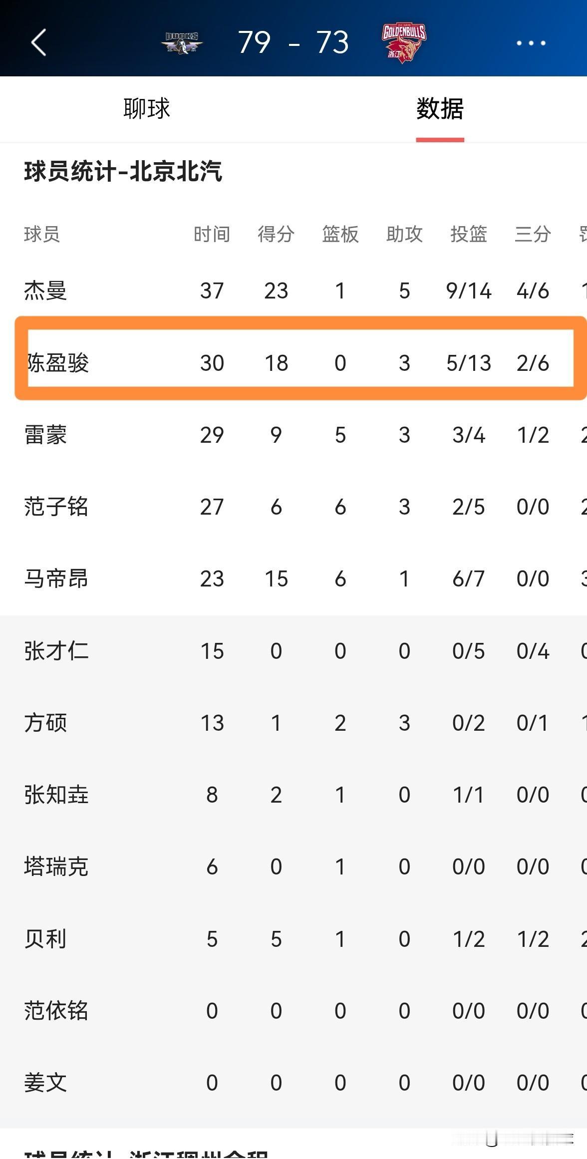 北京北汽球星陈盈骏真是神鬼难测!在今天北京北汽主场以79:73击败浙江稠州金租的比赛中,陈盈骏首发出战30分钟,投篮13中5,其中三分球6中2、罚球7中6得到18分3助攻1抢断,他的场上正负值为-1。 值得一提的是,陈盈骏在上半场比赛中就砍下17分,他在下半场比赛中仅仅依靠罚球得到1分。 老实说,陈盈骏在上半场比赛中的表现堪称天神下凡,可是他在下半场比赛中如同梦游一般。