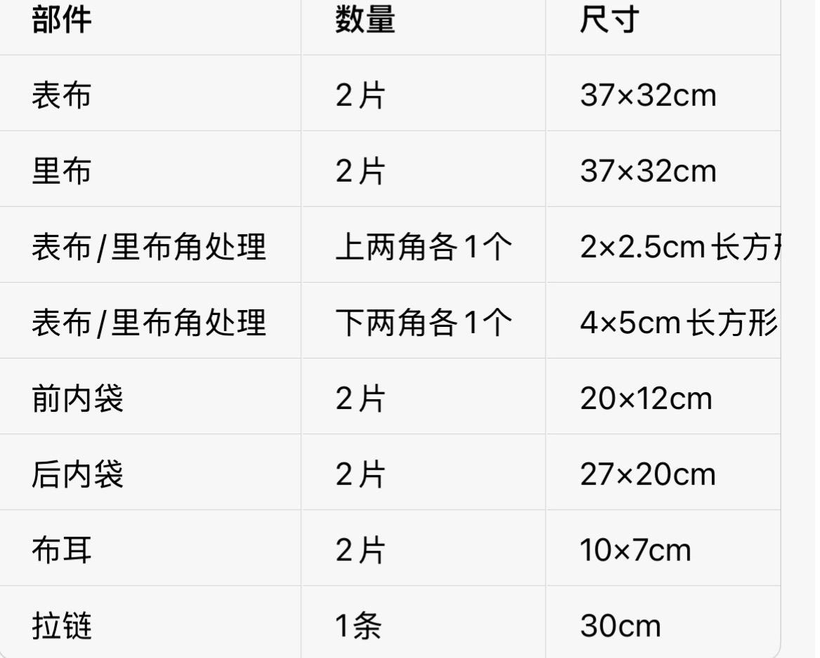 自制帆布斜挎可调节托特包|详细尺寸+完整制作步骤 自己动手做帆布包已经有好几次了,这次第一次尝试做带拉链的款式,选了30cm的拉链适配度刚刚好,有拉链也多了份安全感,不用担心小物件掉落~特意整理了精准的裁剪尺寸和完整制作步骤,记录下来方便自己后续翻看,也分享给同样喜欢手作的小伙伴~ 斜挎可调节托特包 制作顺序 1. 表布/里布各2片37×32cm,分别裁剪上两角2×2.5cm、下两角4×5cm正方形 2. 缝制前内袋(2片20×12cm)、后内袋(2片27×20cm),分别缝在对应里布内侧 3. 制作2片10×7cm布耳,卡入D字扣后成型 4. 表布上边缘折边,嵌入30cm拉链,同时将布耳夹在拉链两侧折边处车缝固定 5. 表布正面对折,里布正面对折,分别车缝两侧边+底部,整理出底部立体弧度 6. 表布翻到正面,里布保持反面,将里布套入表布内,正面对齐后车缝上边缘 7. 从内袋开口处翻出整个包身至正面,熨平上边缘并压线加固 8. 制作2.5cm宽黑色织带肩带,穿入日字扣调节长度,两端折窄后扣上龙虾扣,再与包身D字扣连接