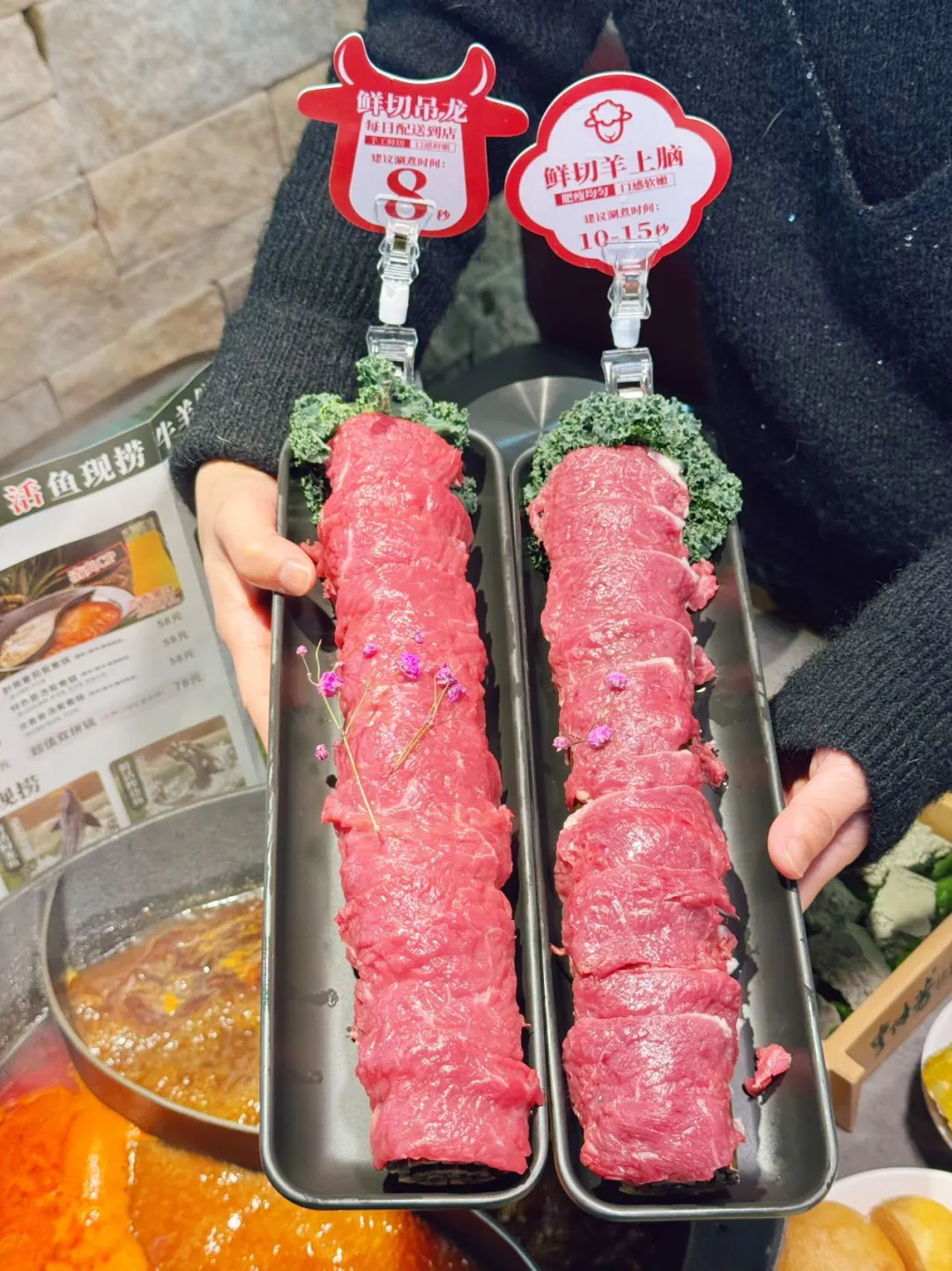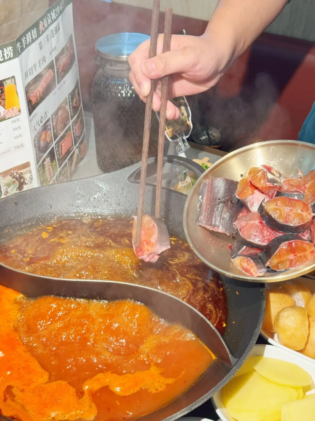 [哇R]一进门就看见大鱼在水里游来游去~ 师傅在旁边现捞现处理 新鲜看得见,上桌时还透着鲜气 一个人吃完一整盘都不觉得腻😋 [向右R]牛肉是明档手切的,纹路漂亮得像雪花❄️ 在辣锅里涮几秒就捞出,蘸满料汁入口即化 真的香到不想说话!! [赞R]蔬菜区十几块随便拿,种类多还水灵灵的 吃完默默收藏进我的宝藏清单🧾 天冷就该来顿这样的火锅呀~