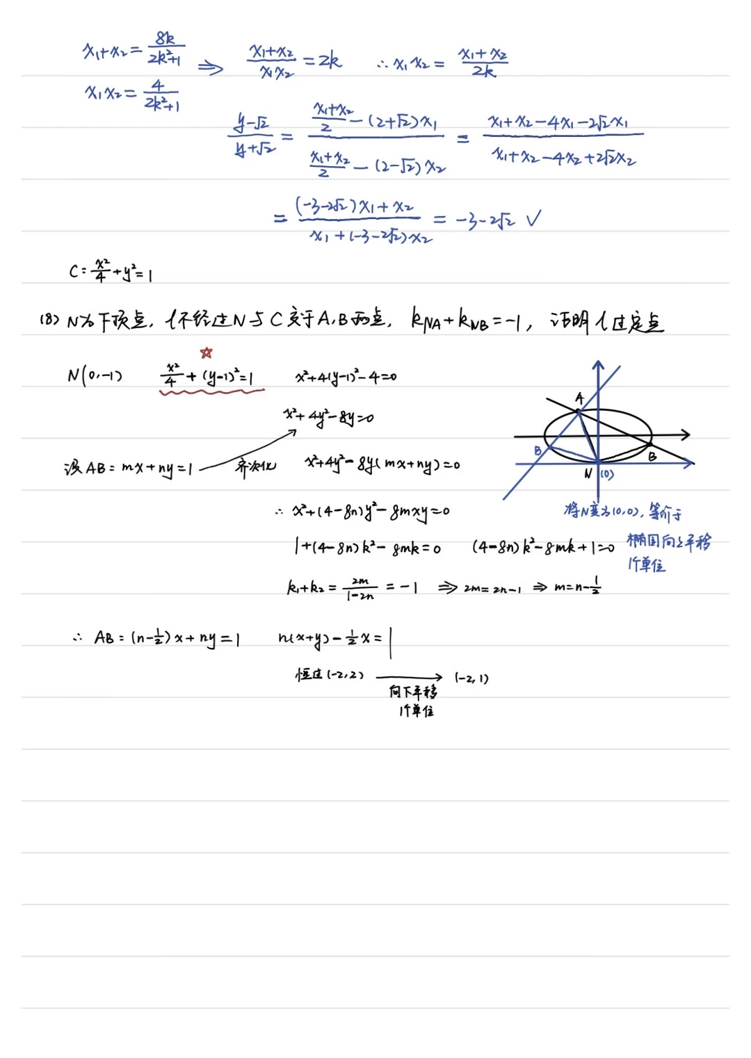 其实是来自一数的一题7问,我增加了平移齐次化的手电筒模型,建议还是用常规方法带着学生算一次,所有技巧都让学生感悟,我觉得最大用处在于增加题感和提高计算能力。 这些题目可以作为圆锥曲线解答题的入门题目,课堂上当成例题带着学生完成。 要求学生重视计算和书写,很有必要,我是课堂上带着学生做了一次。
