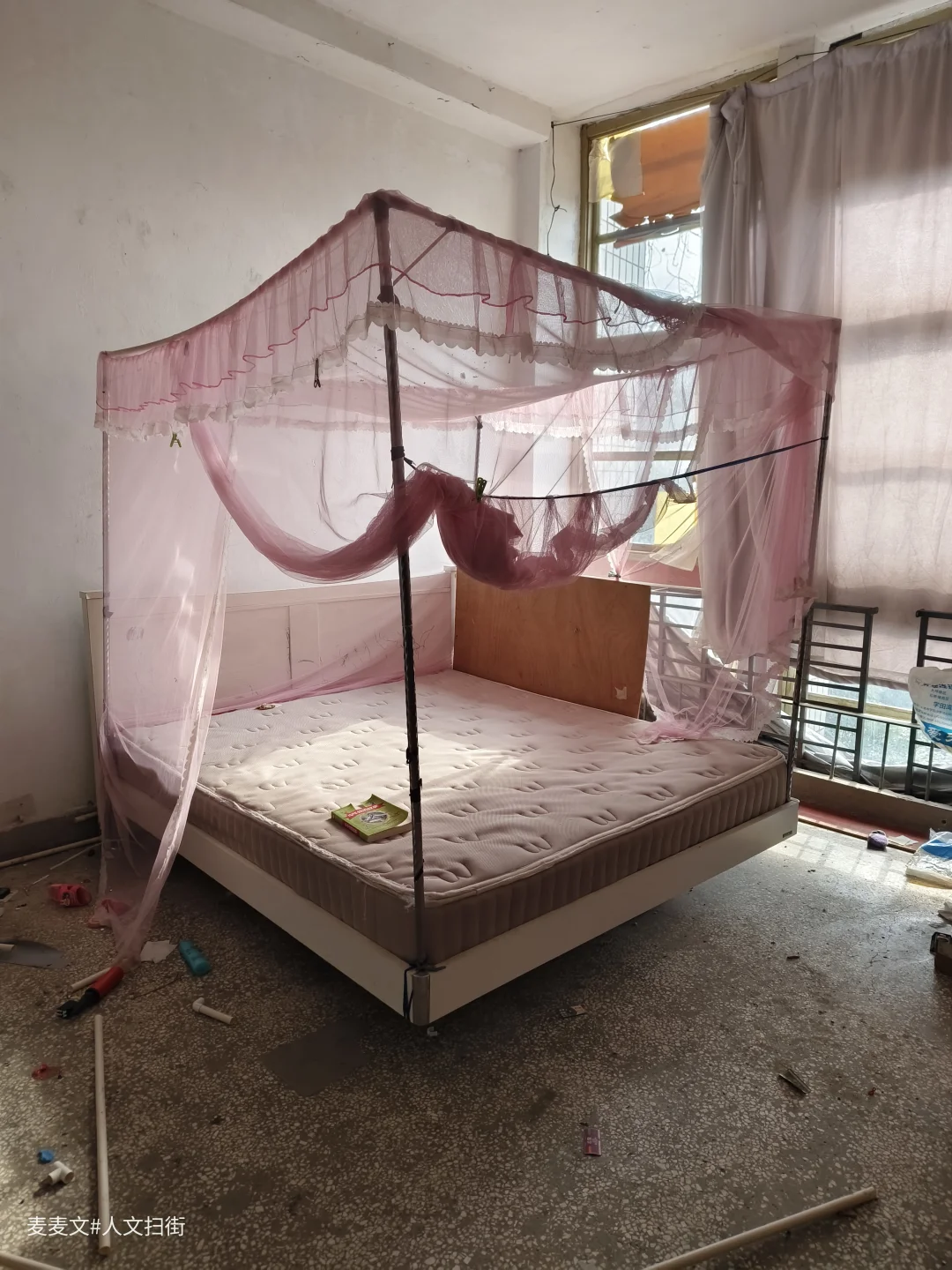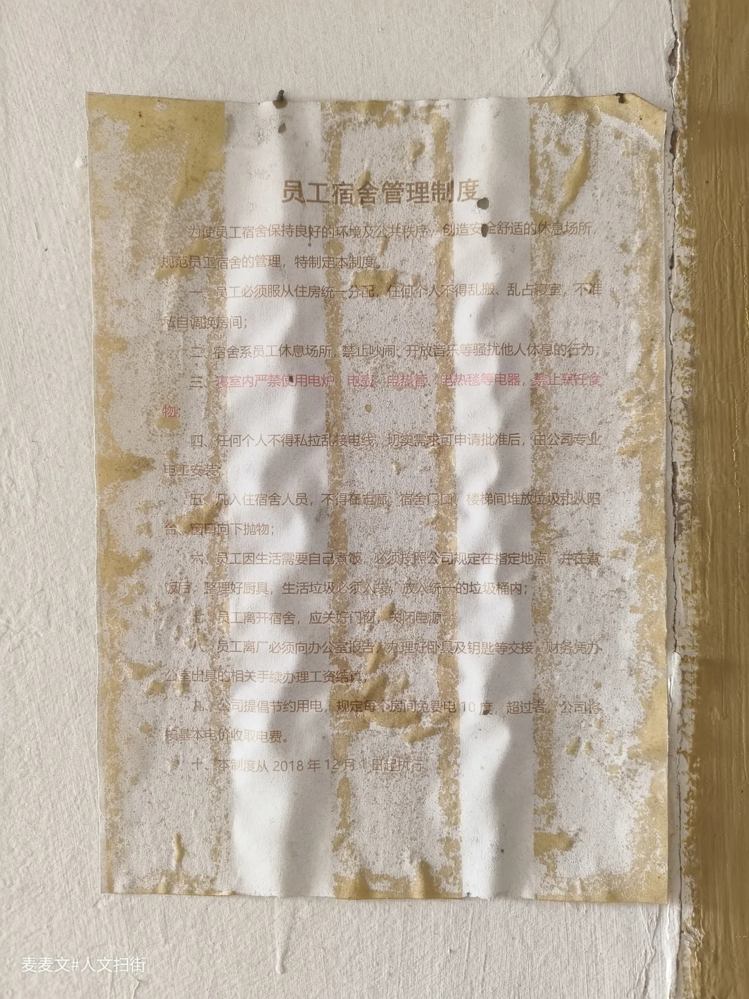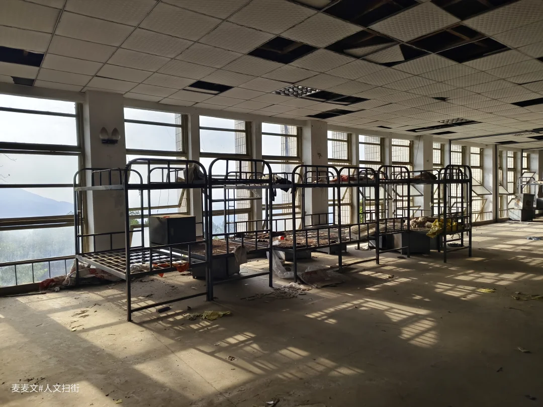 后来它部分区域被改造成员工宿舍,礼堂入口被砖头封死。房间只留下一排排铁架高低床、泛黄的《员工宿舍管理制度》,和墙上褪色的标语,无声诉说着从“光影盛宴”到“烟火日常”的变迁。