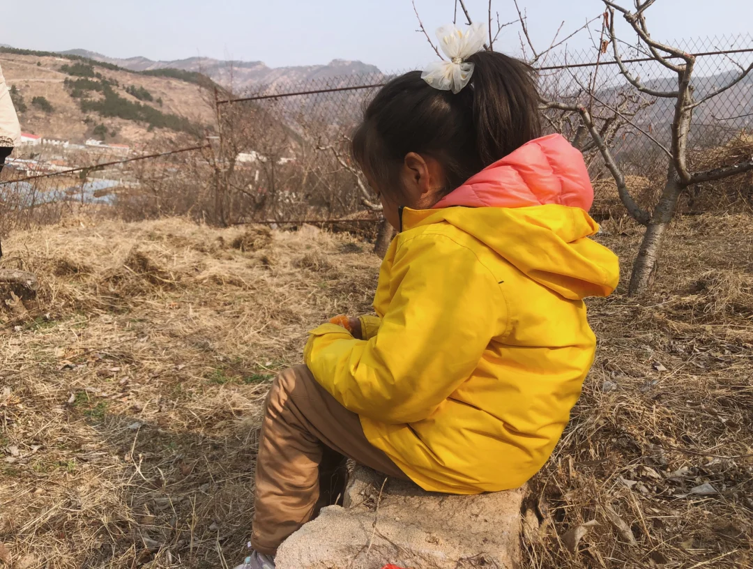 第一次挖荠菜的玏玏人儿,也认识了荠菜的模样儿,到处在帮忙找荠菜,找着找着也累了,休息一会儿。
