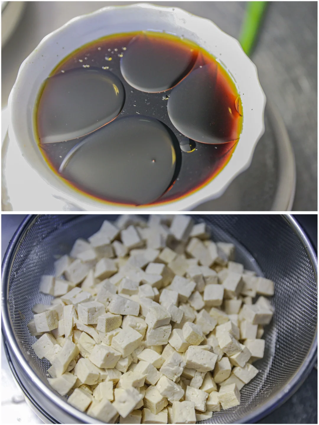 [种草R]1.豆腐切成小方丁丁,葱切小段,蒜切末。蚝油、酱油、料酒、白糖、清水、香油放入一个碗中,做成酱汁。