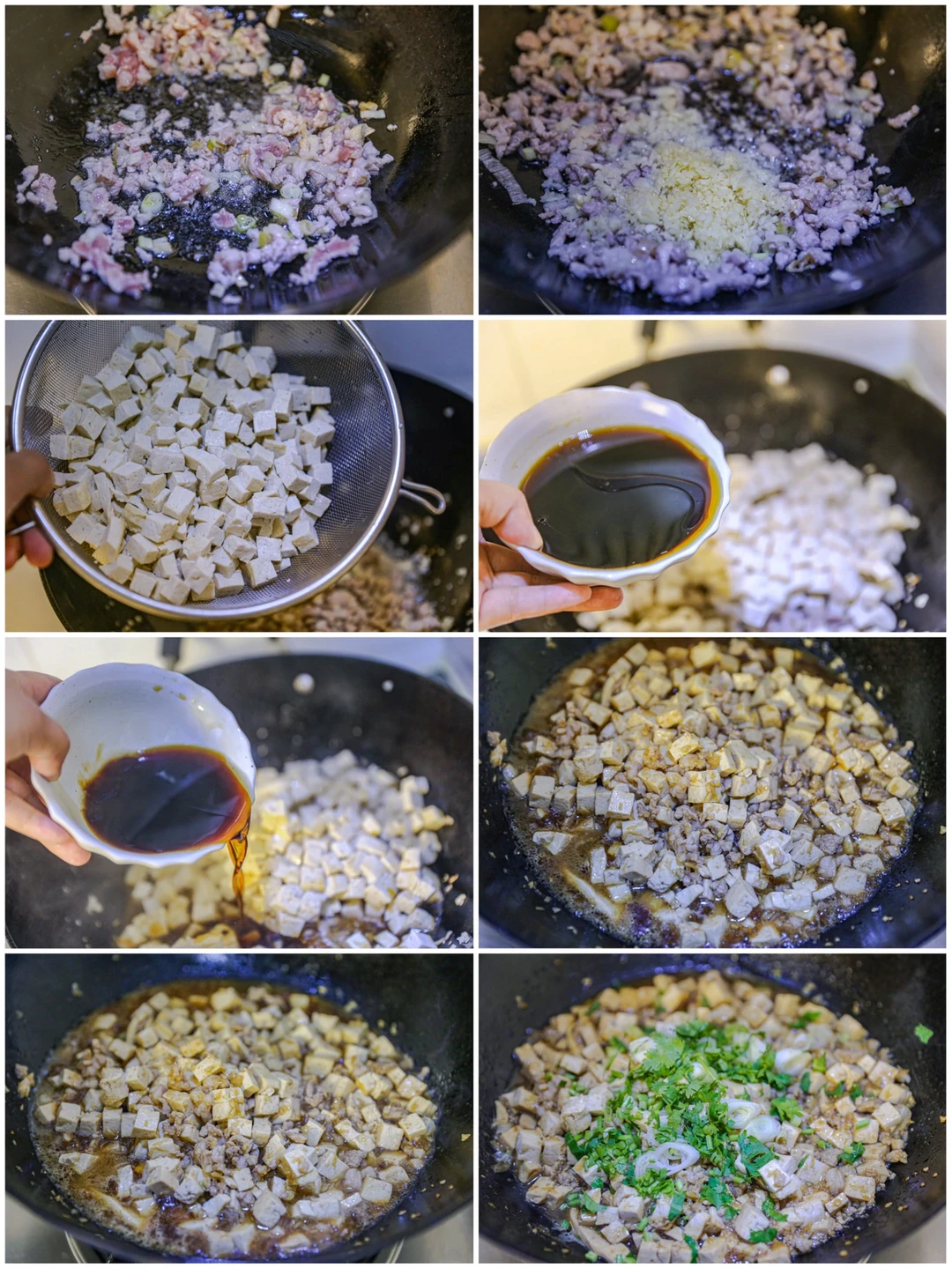 [种草R]3.炒锅烧热,加入适量色拉油,热锅凉油放入肉末煸炒,小火慢慢煸炒至肉沫吐油加入蒜末炒香,放入汆烫好的豆腐,倒入碗汁。大火烧开之后转中小火烧至汤汁变浓稠加入青葱段翻炒均匀即可出锅。